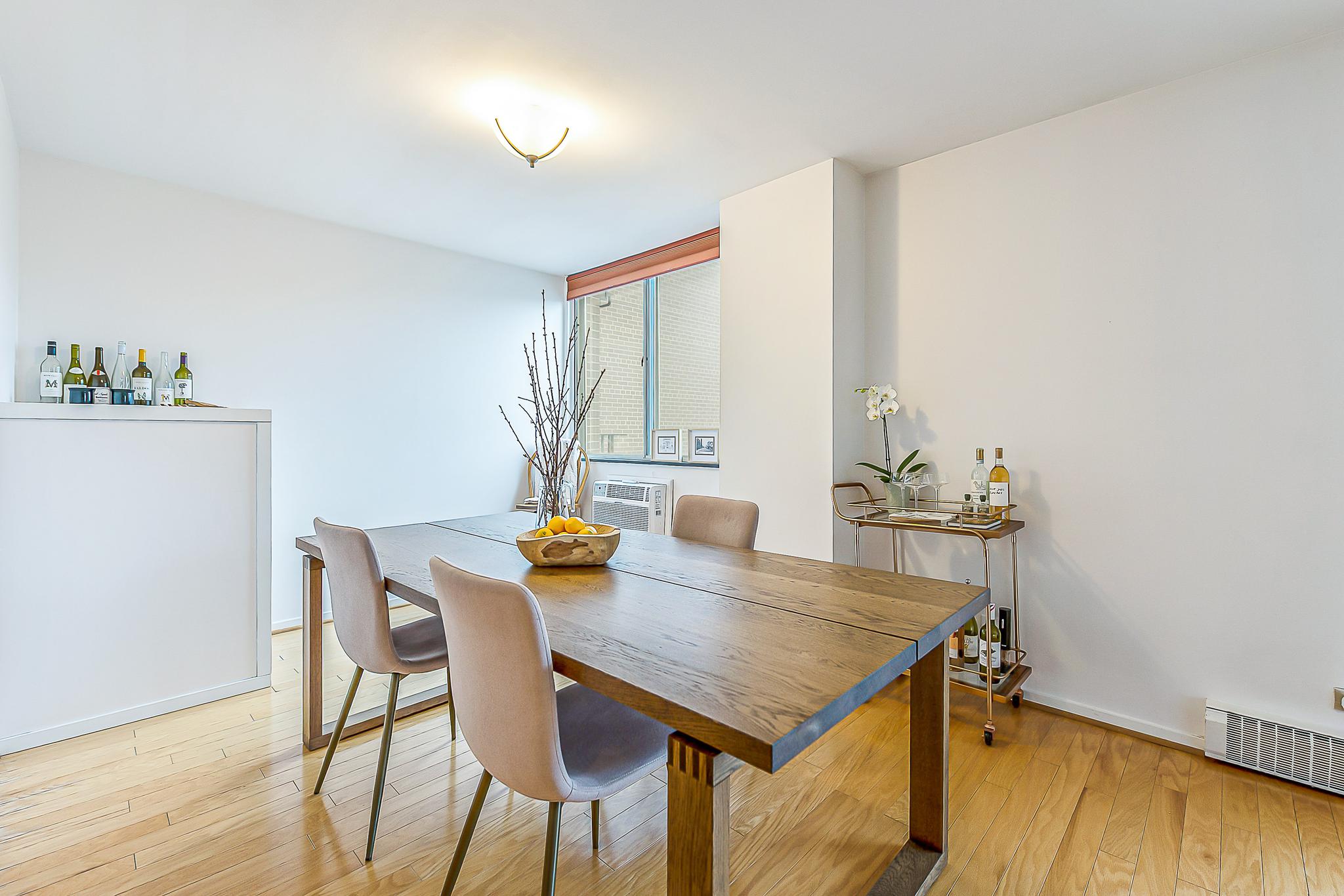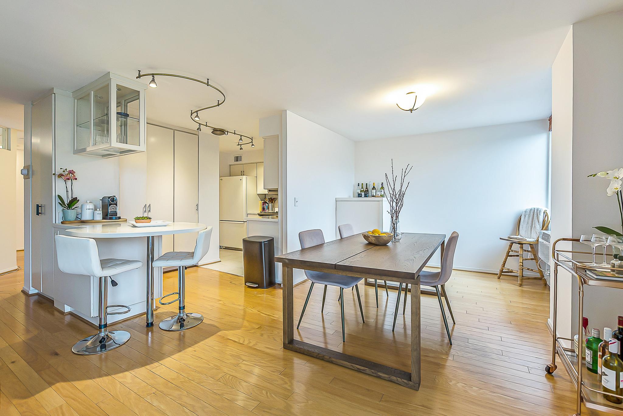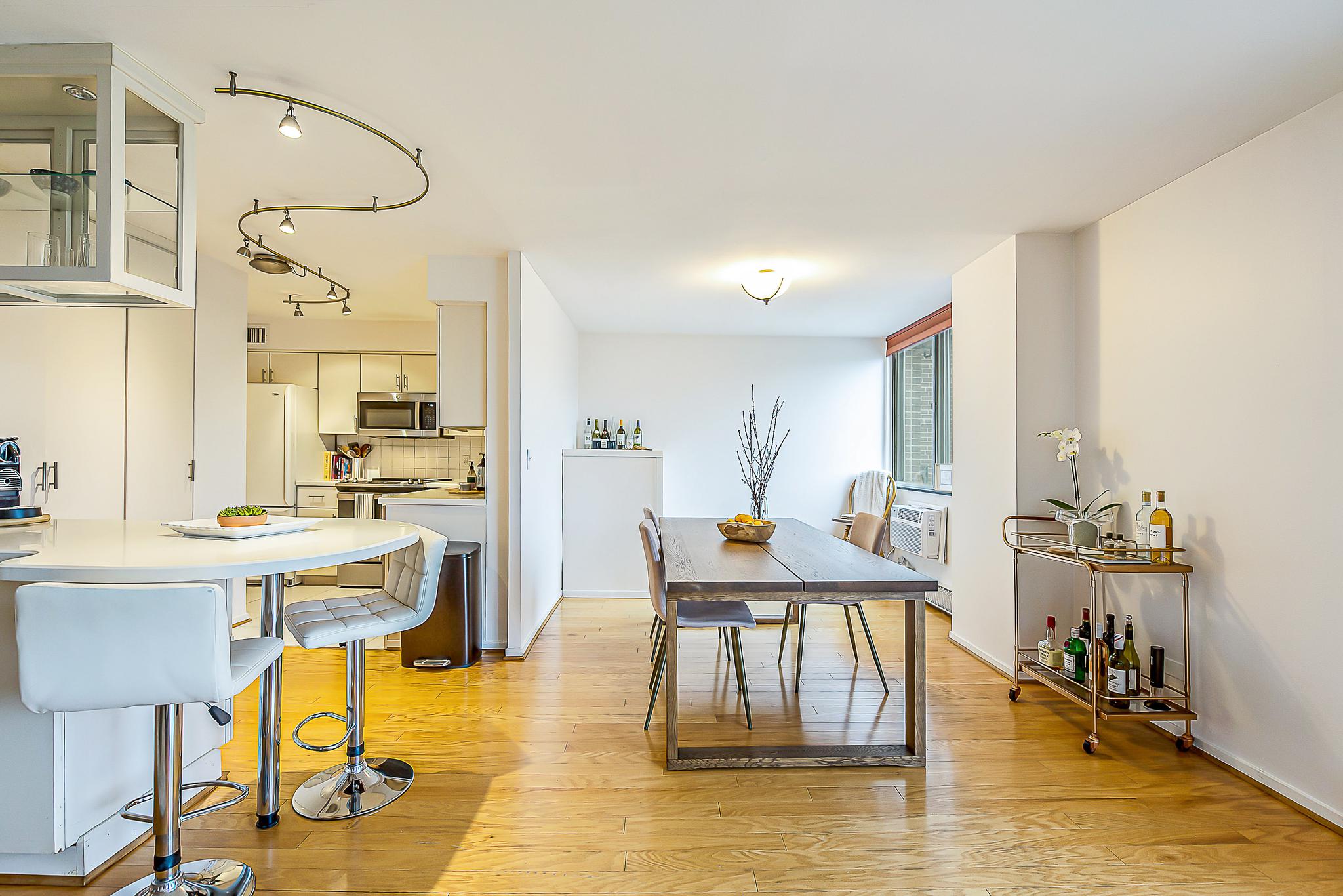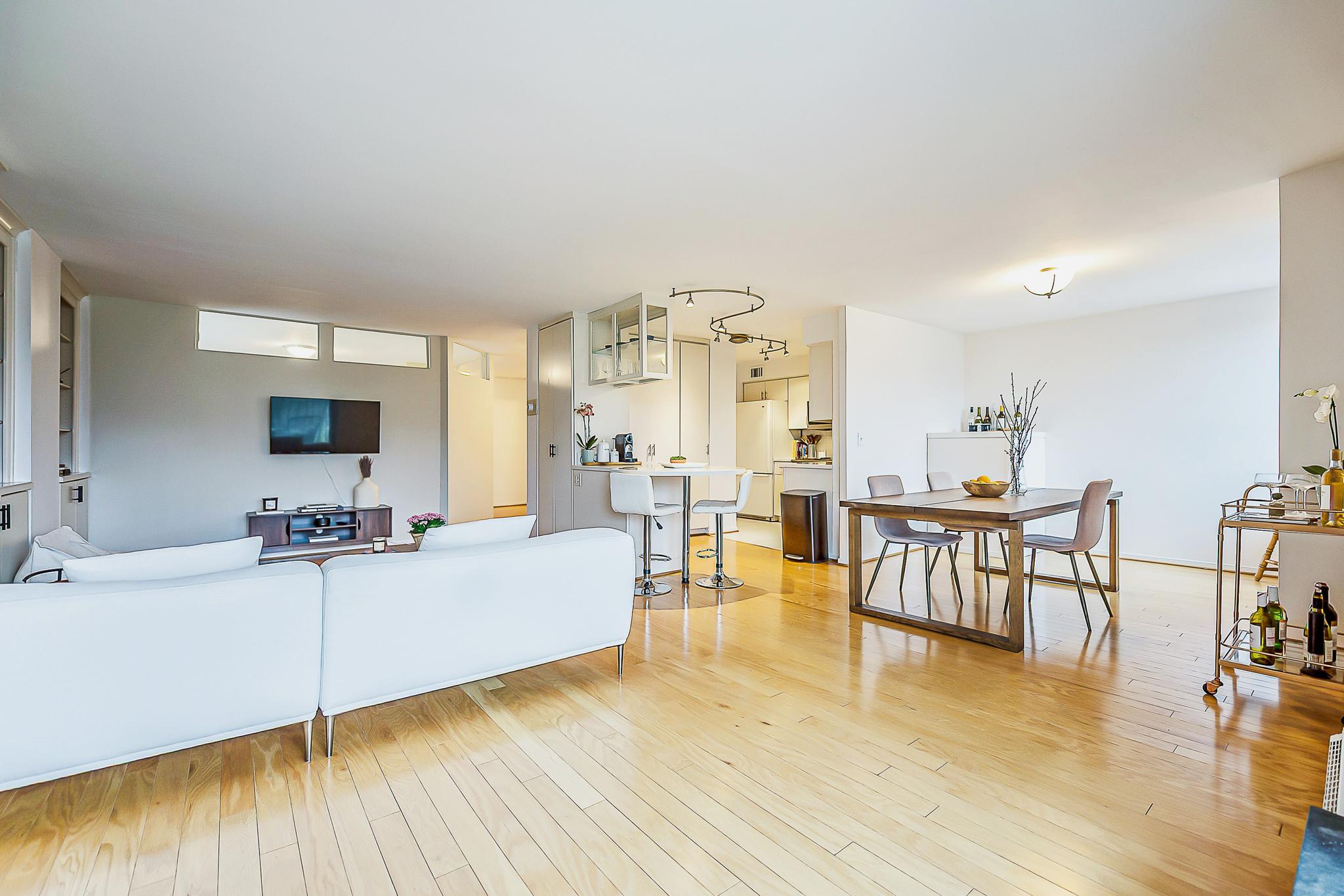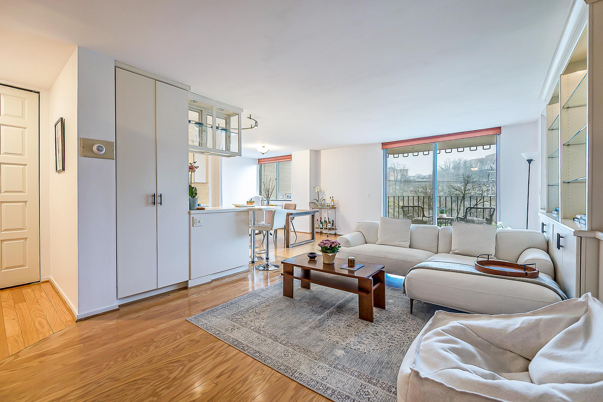 Step inside to find hardwood floors that flow seamlessly through the entry, living, and dining rooms. A spectacular south-west facing wall of windows floods the space with natural light, while a large, covered, private balcony allows you to take in the serene surroundings. The living area is anchored by 25 feet of custom built-in display shelving, cabinetry, and a convenient built-in dry bar for entertaining.