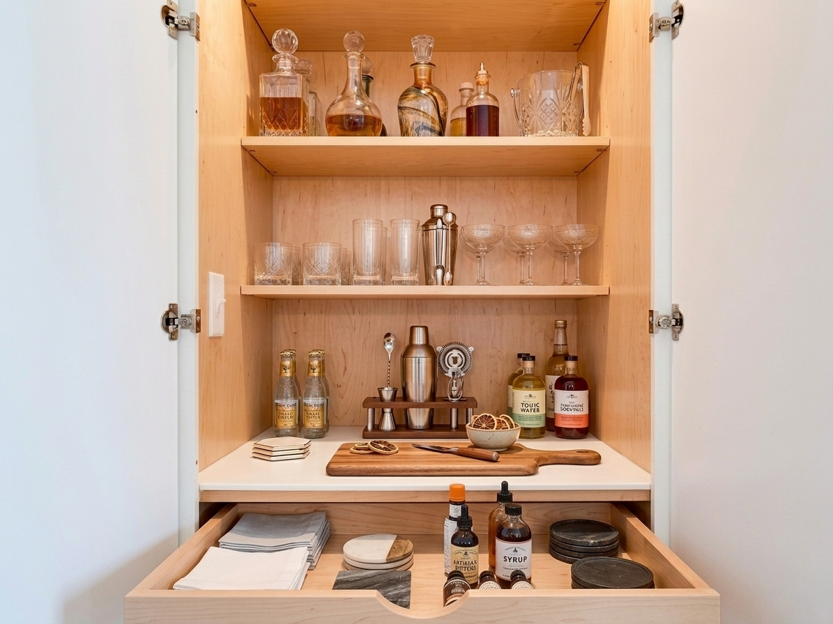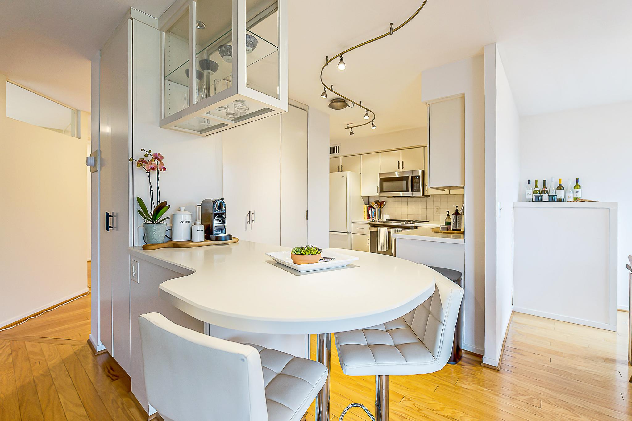 The bright, open renovated kitchen is beautifully crafted with painted solid wood cabinets, sleek Corian countertops, a tile backsplash, and under-cabinet lighting. You will love the deluxe pantry with pull-out organizers and the clever peninsula topped with glass-door display cabinets.