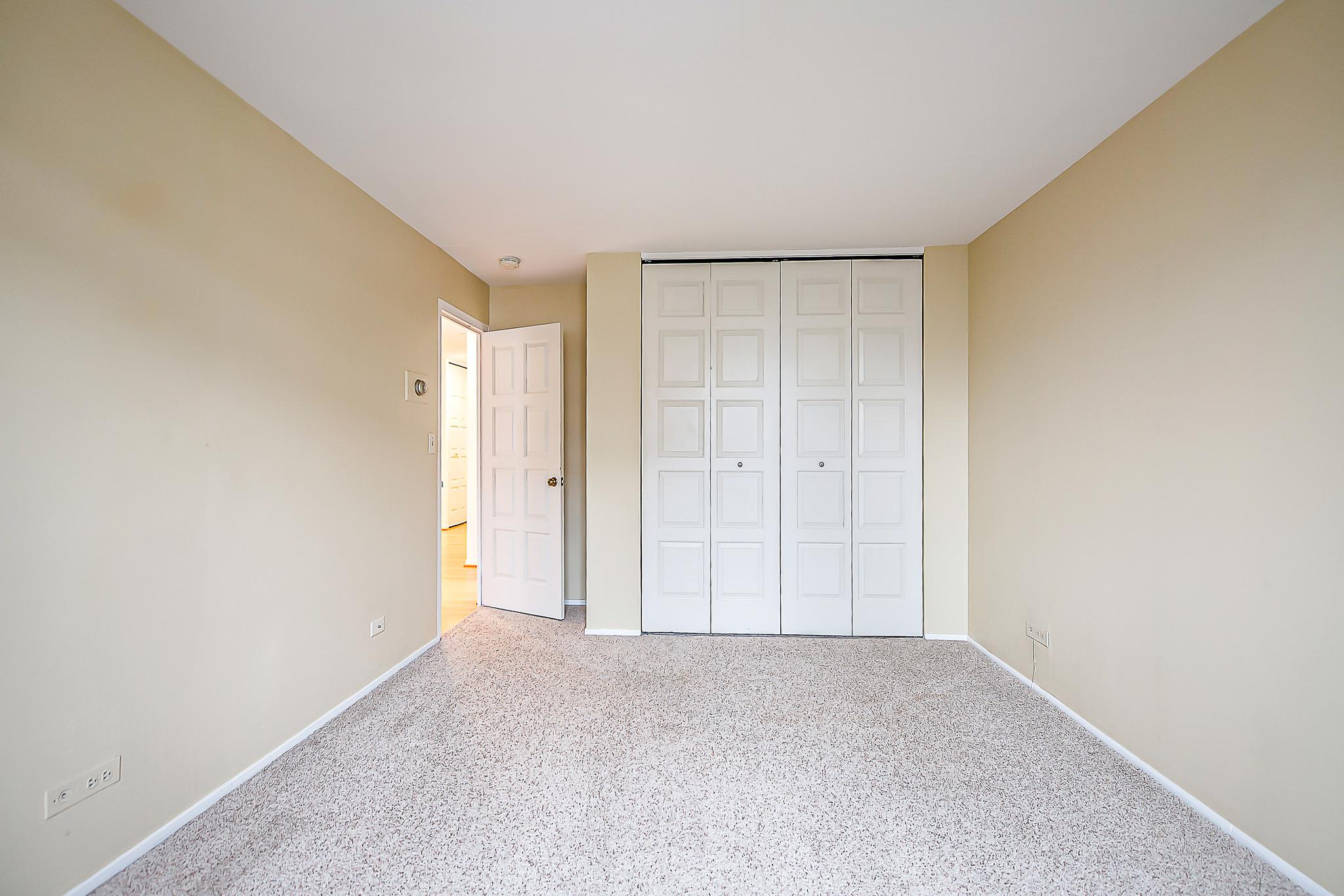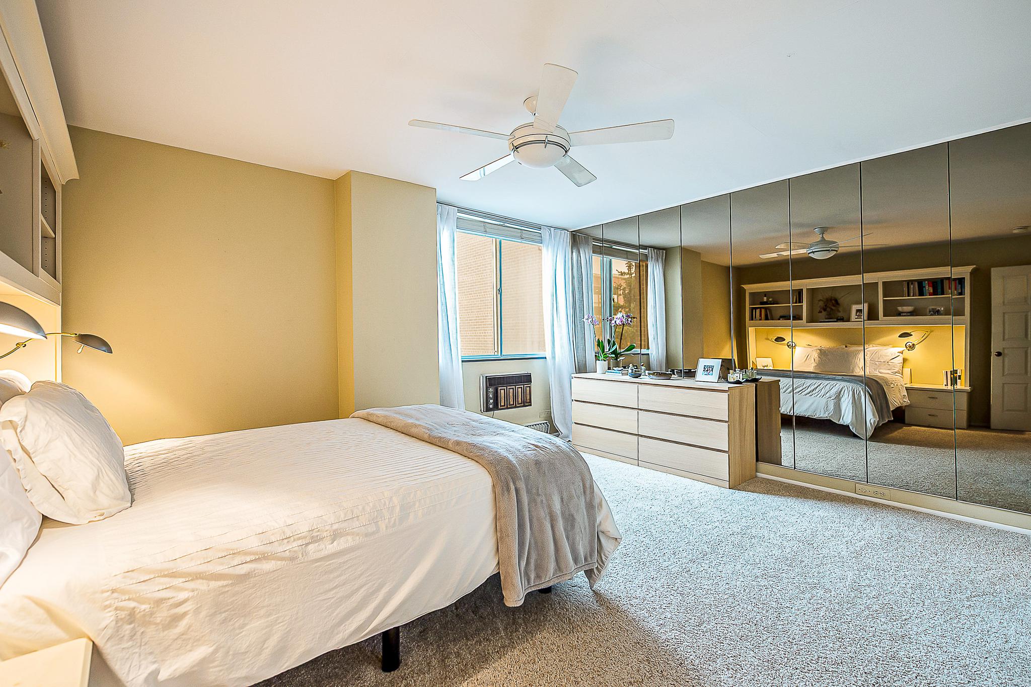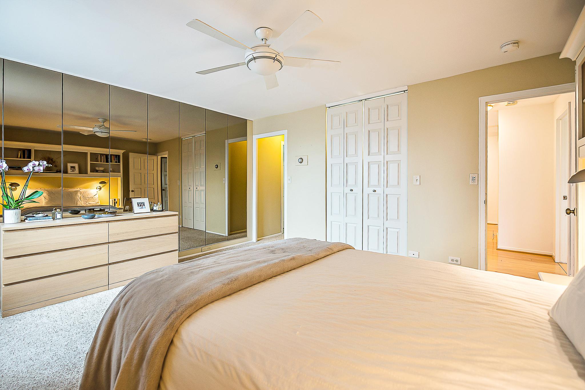 This layout features a generous study, complete with a large west-facing window to capture the afternoon sun. Both the guest bedroom and the primary suite feature plush carpeting, solid wood doors, and large closets with custom organizers. The primary suite serves as a true retreat, offering a built-in bookcase headboard with sconces, a mirrored dressing wall, an organized walk-in closet, and a private full bathroom.