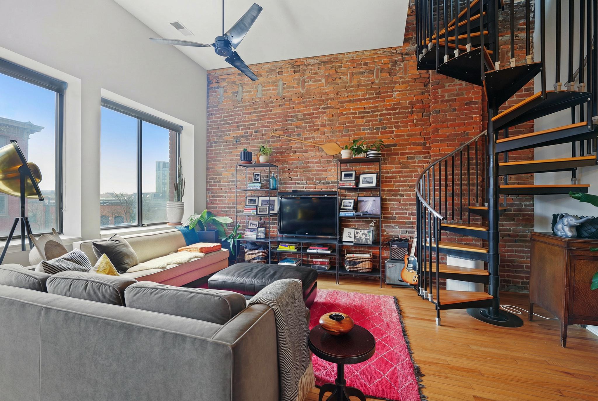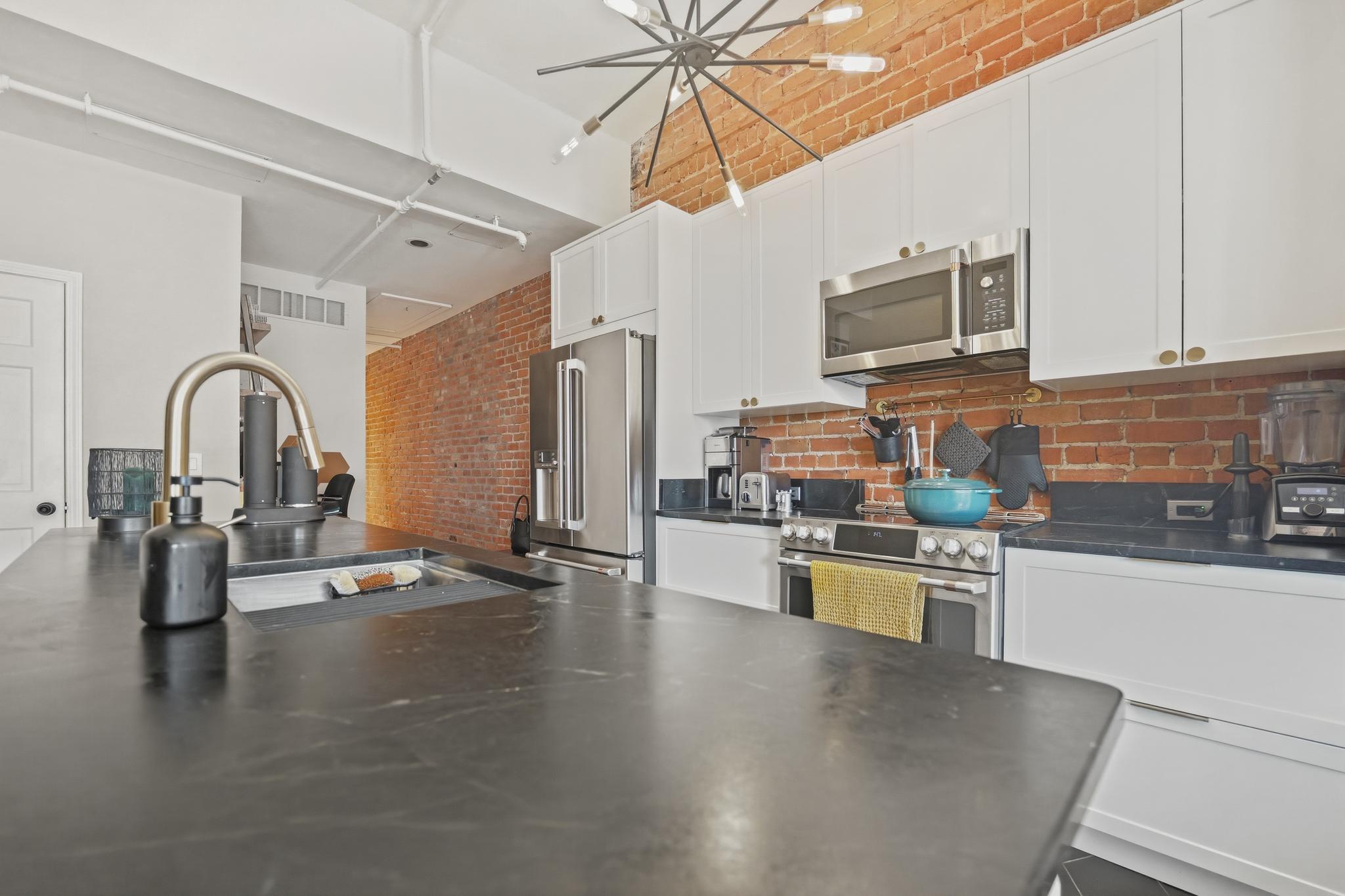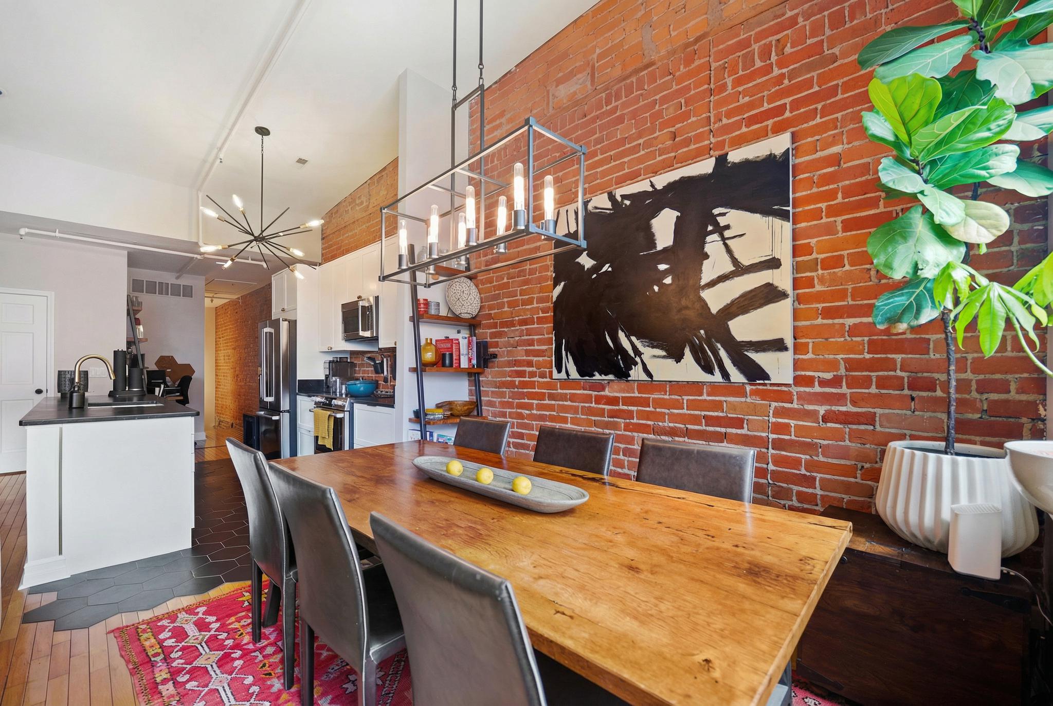 Step inside to discover an open floor plan featuring exposed brick walls, hardwood floors, and an abundance of character. The kitchen is a chef’s dream, boasting stainless steel appliances, soapstone countertops, and a spacious center island - perfect for entertaining. Adjacent to the kitchen, the dining area is ready to host gatherings of any size, while the great room offers a cozy yet vibrant space to relax and take in the city views.