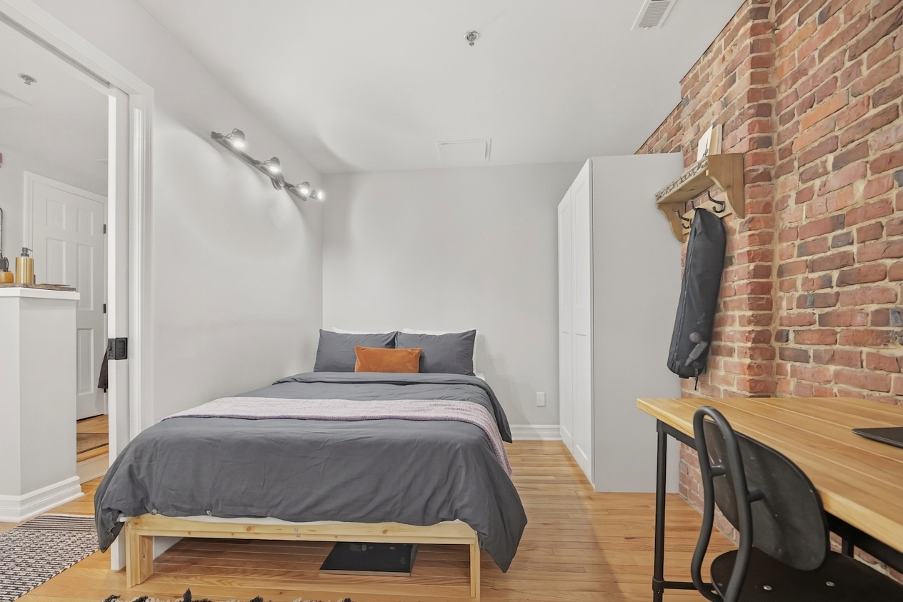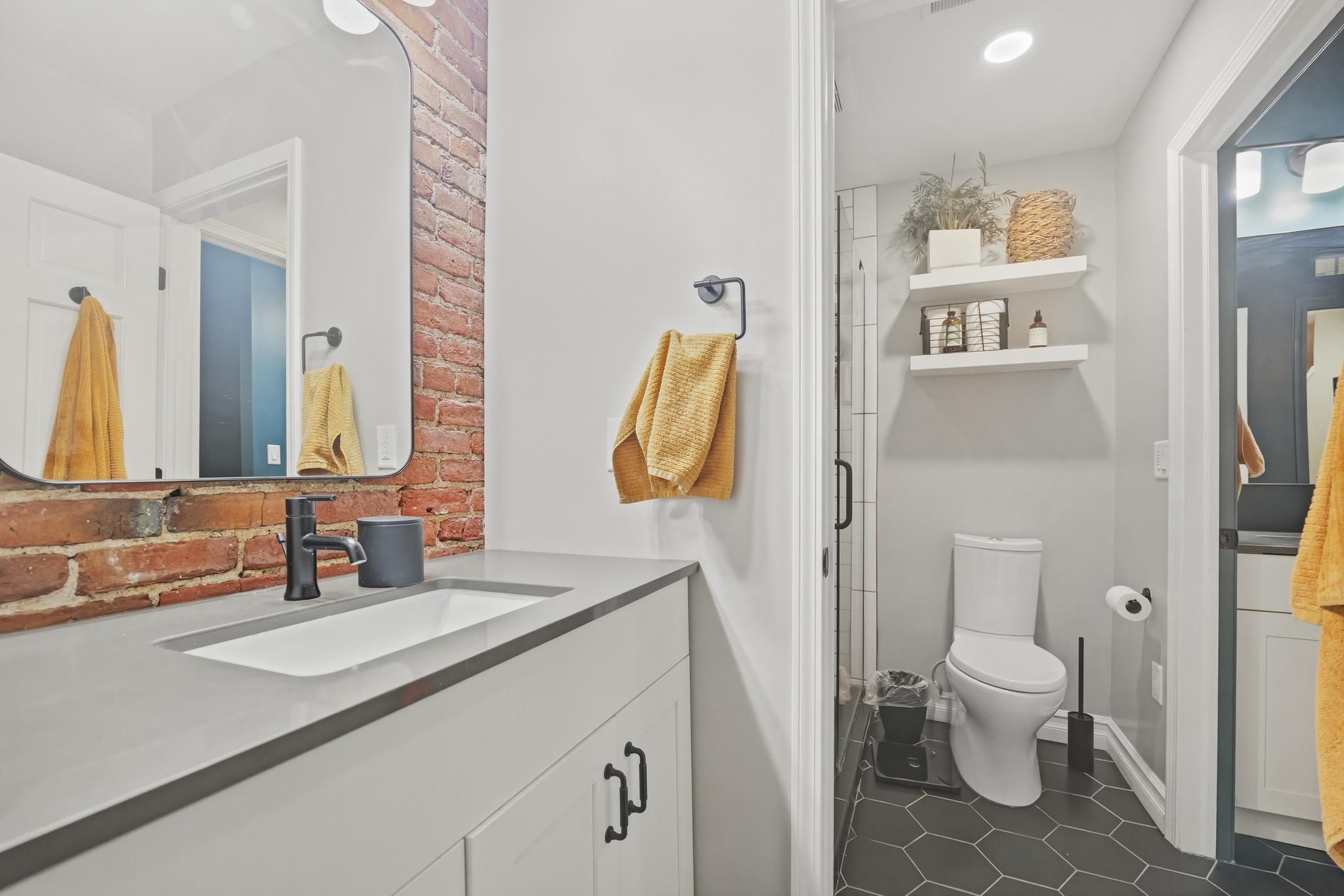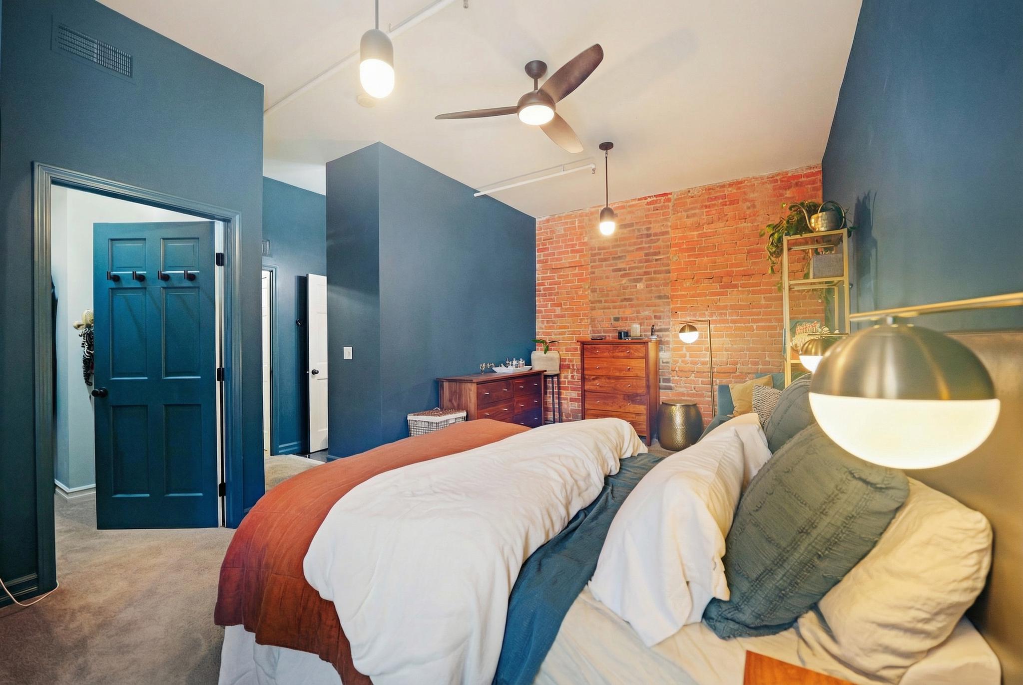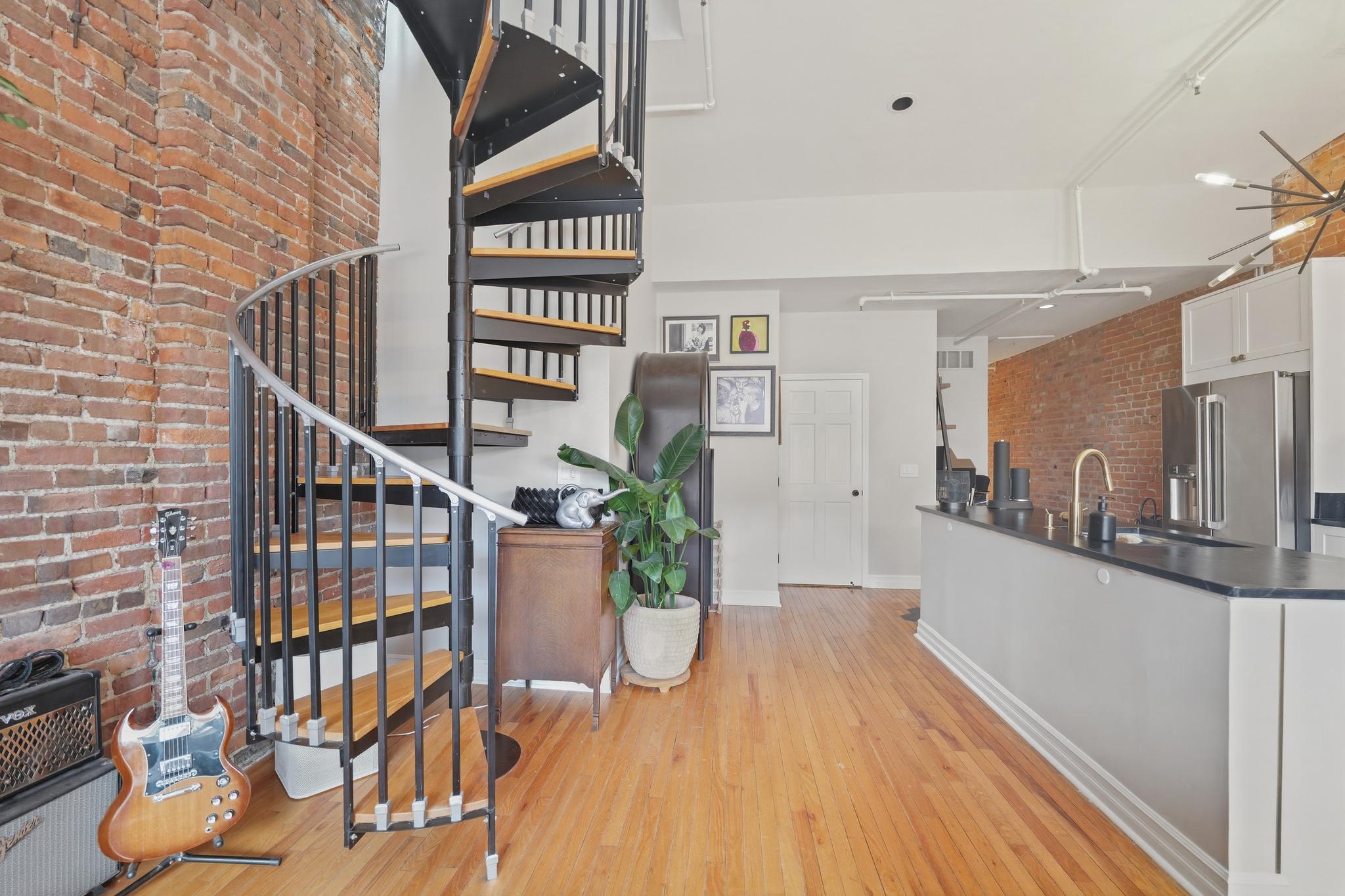Step inside to discover an open floor plan featuring exposed brick walls, hardwood floors, and an abundance of character. The kitchen is a chef’s dream, boasting stainless steel appliances, soapstone countertops, and a spacious center island - perfect for entertaining. Adjacent to the kitchen, the dining area is ready to host gatherings of any size, while the great room offers a cozy yet vibrant space to relax and take in the city views.