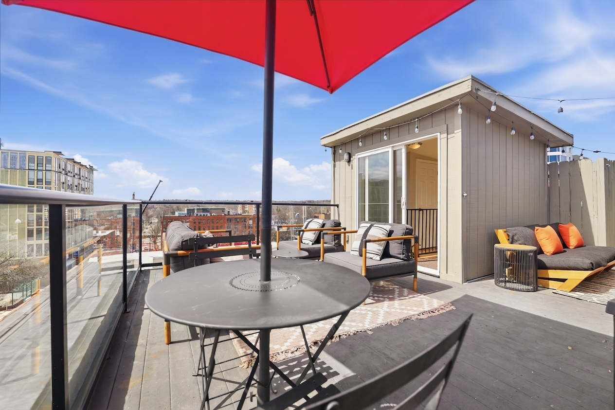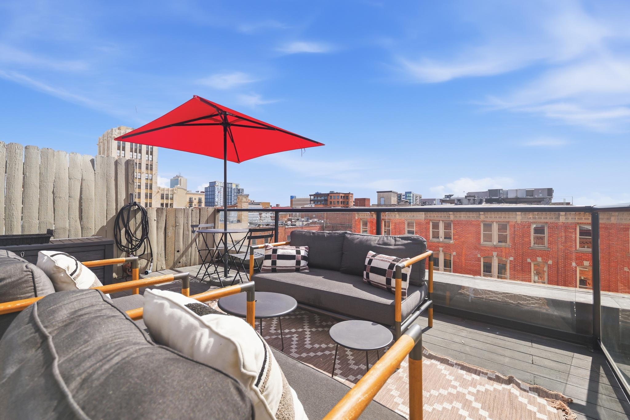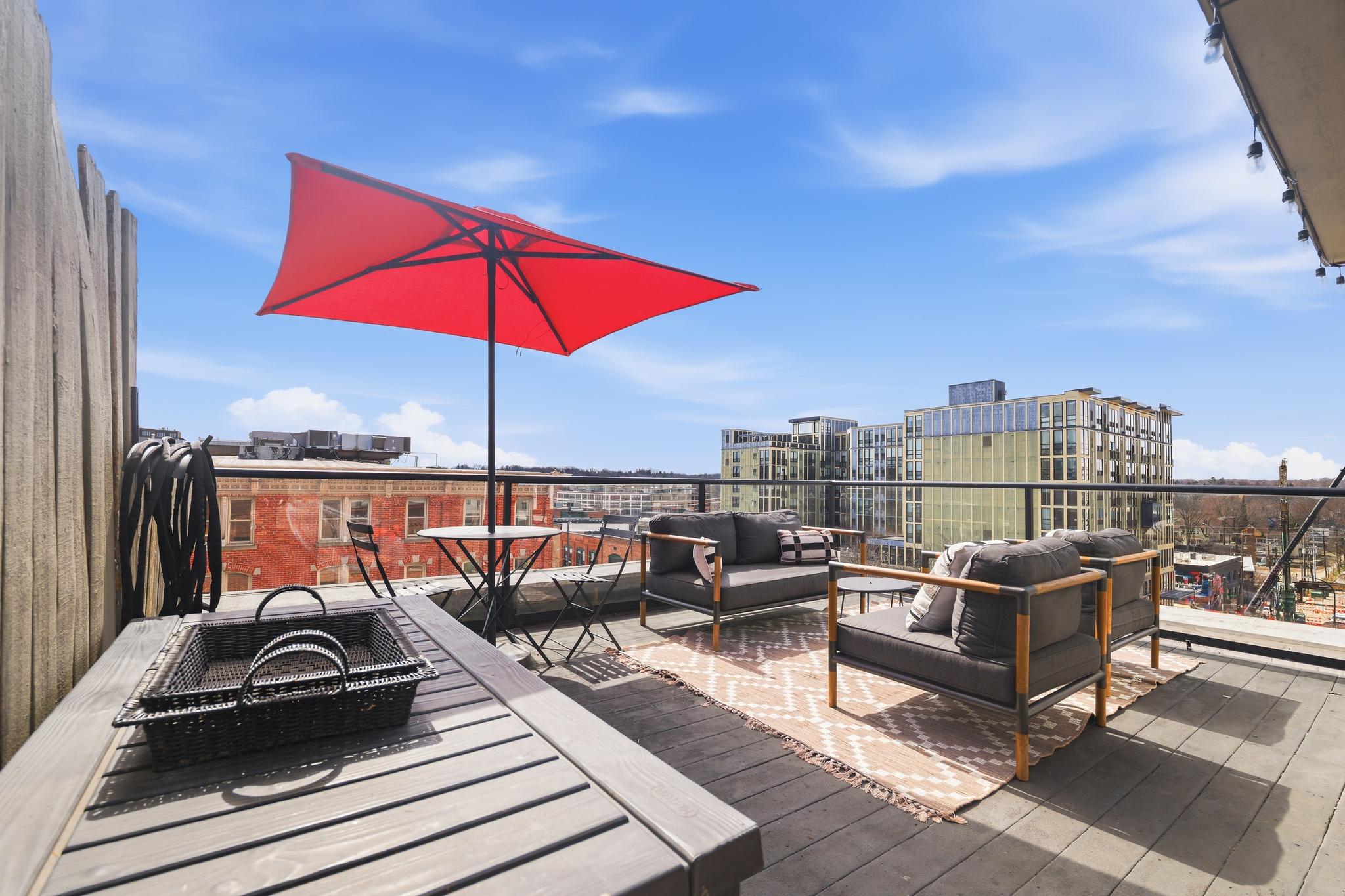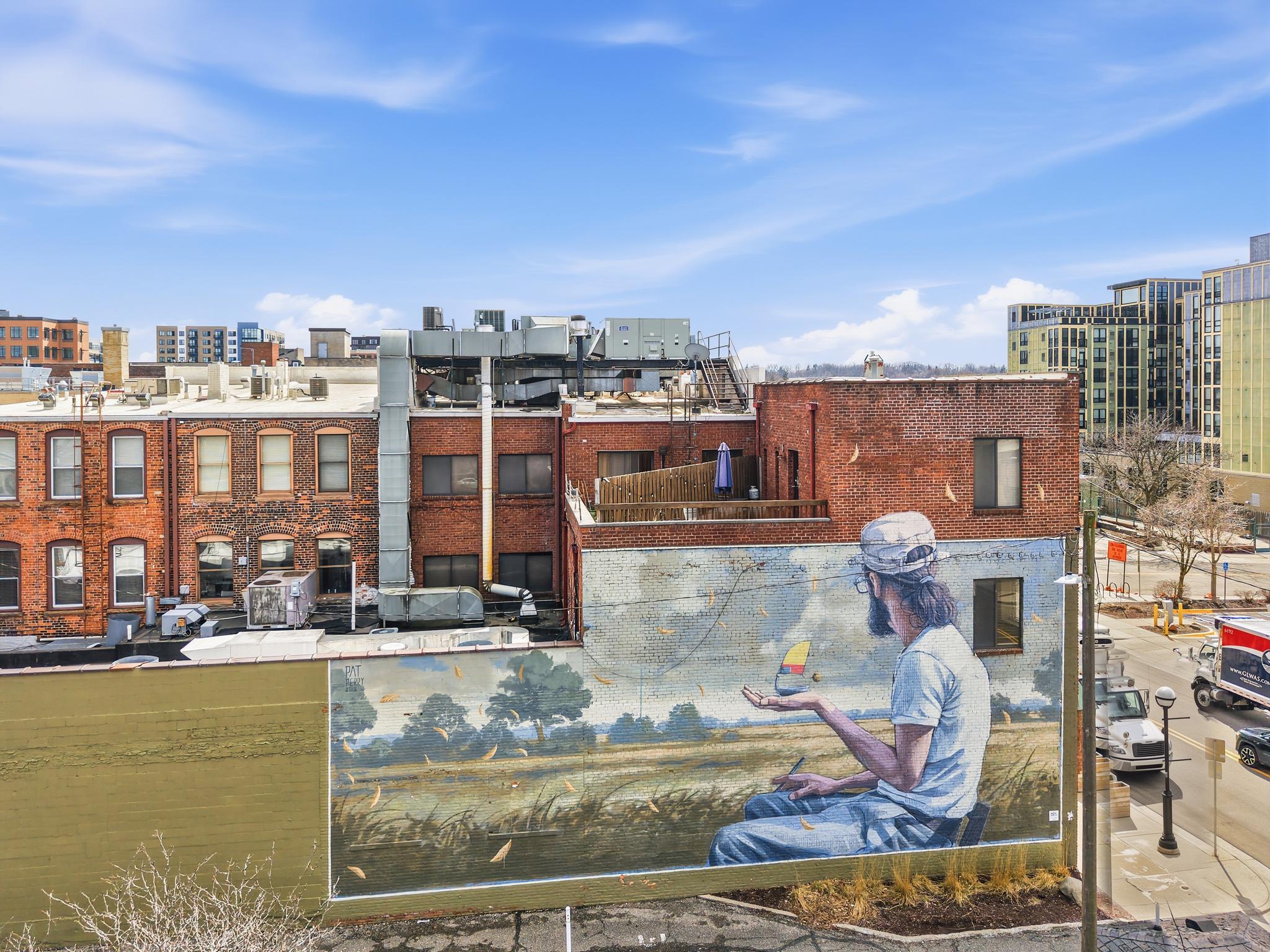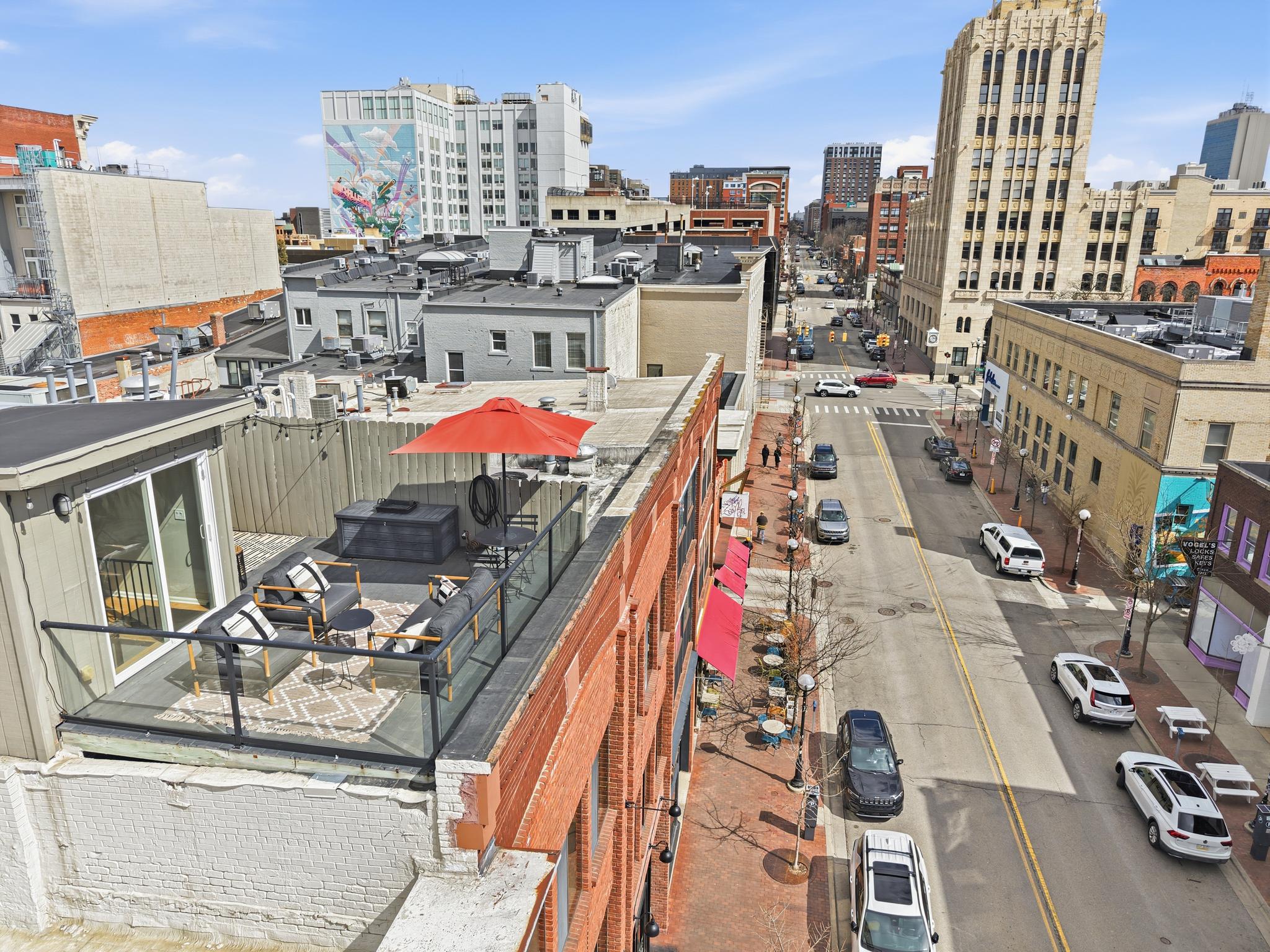 A spiral staircase leads to the show-stopping rooftop deck, where you’ll find ample space for entertaining or unwinding while overlooking the lively streets of Ann Arbor. On the lower level, the primary suite offers a peaceful retreat with a walk-in closet and a thoughtfully designed ensuite bath. A second bedroom, ideal for guests or a home office, and an additional half bath complete the space.