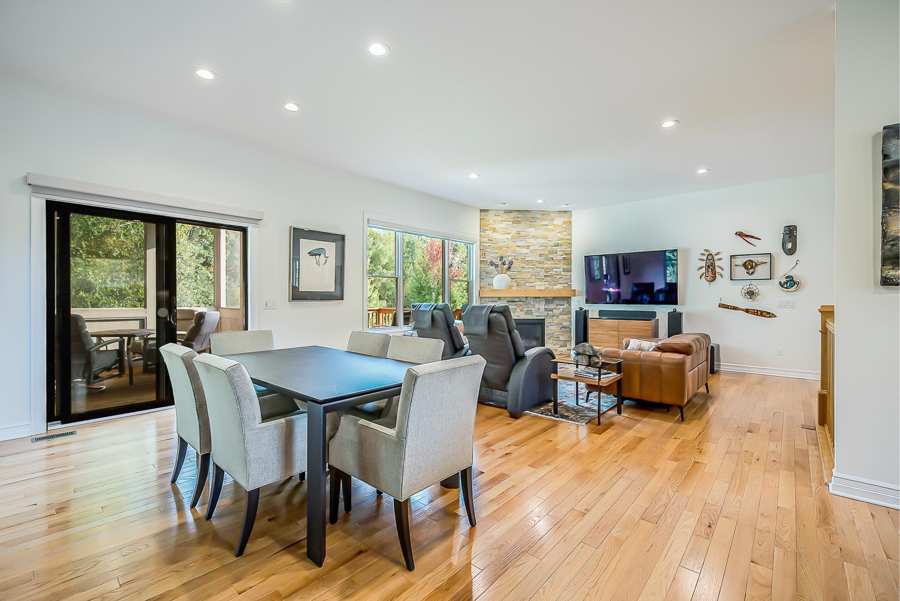 Step inside to an expansive and practical open floor plan, where stunning hardwood floors guide you through the main level. The great room serves as the heart of the home, featuring a magnificent floor-to-ceiling stacked stone fireplace and large windows that frame serene greenbelt views. This inviting space flows seamlessly into the formal dining area, which provides access to an enclosed three-season patio - perfect for enjoying the tranquil surroundings.