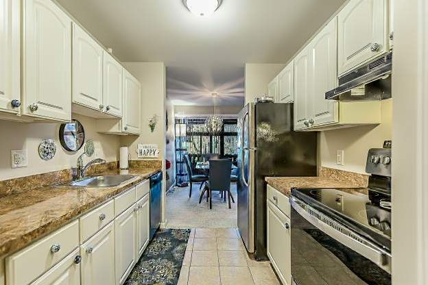 The galley-style kitchen shines with white cabinets, stainless steel appliances, and ceramic tile flooring, seamlessly connecting to a generous dining area. The bedroom offers a tranquil retreat with an oversized walk-in closet, while the updated bathroom features a large vanity with expansive countertop, and a tiled tub/shower combo.