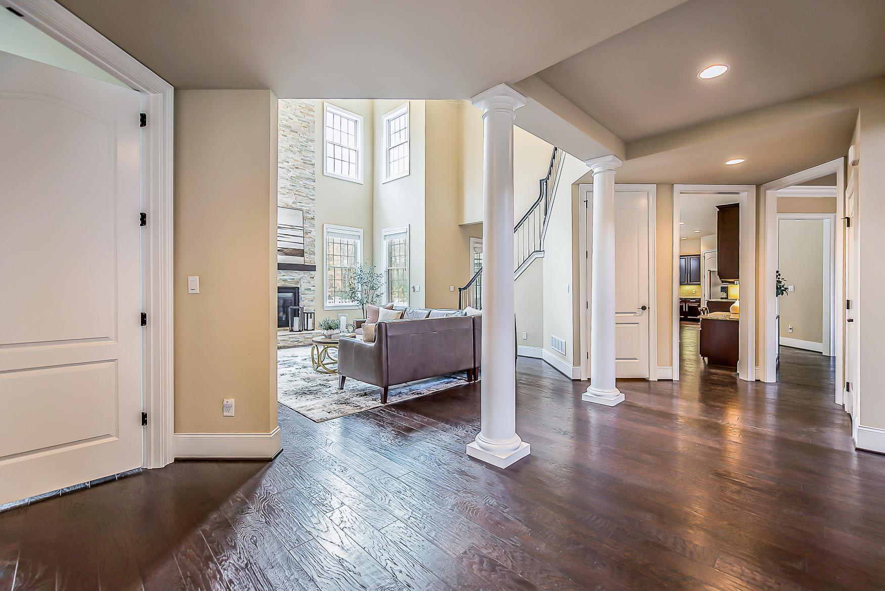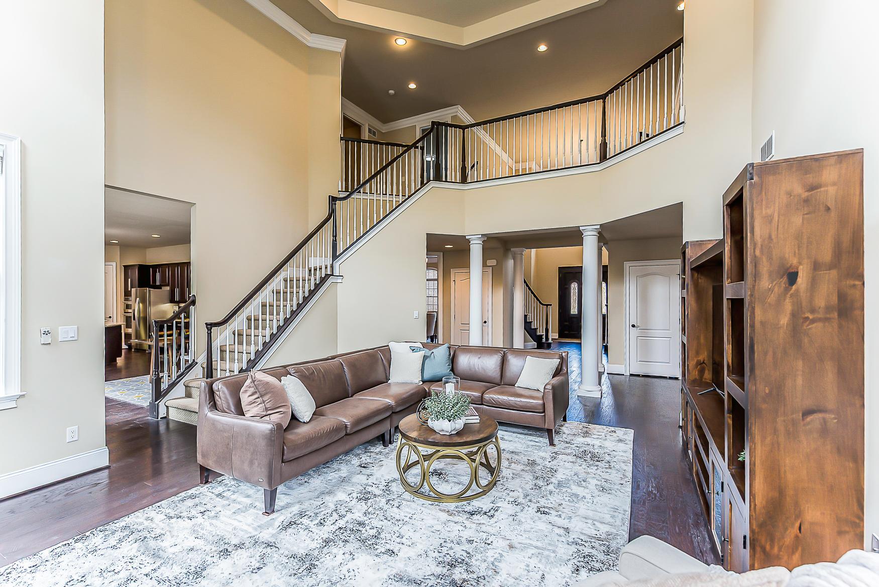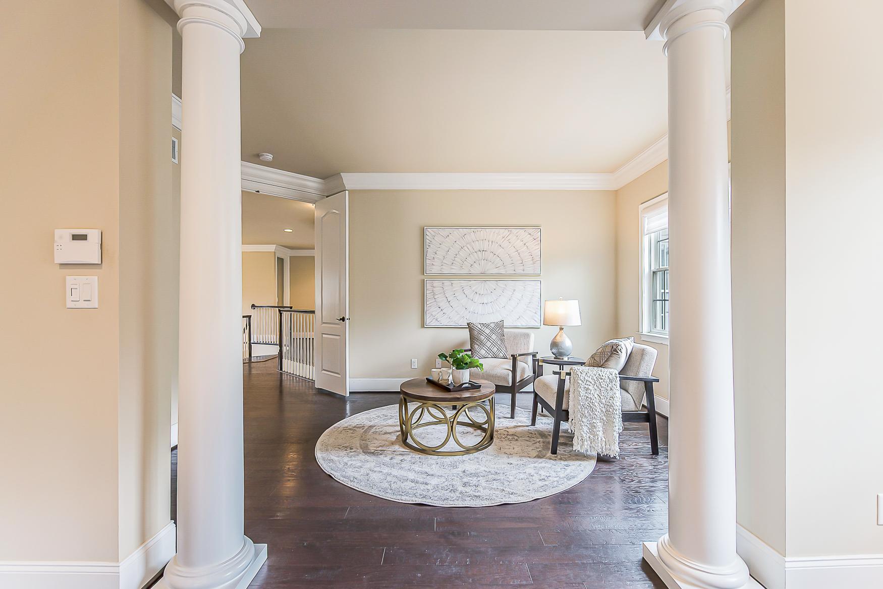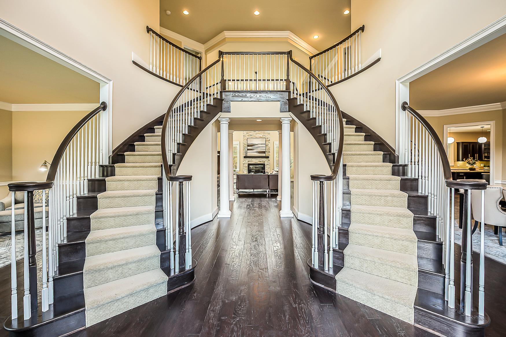 A breathtaking dual staircase greets you upon entry, setting a tone of grandeur that continues throughout. Rich hardwood floors flow across the main level, accented by stately architectural columns and intricate crown molding. The formal living room, bathed in natural light and detailed with classic chair rail molding, provides an ideal space for welcoming guests.