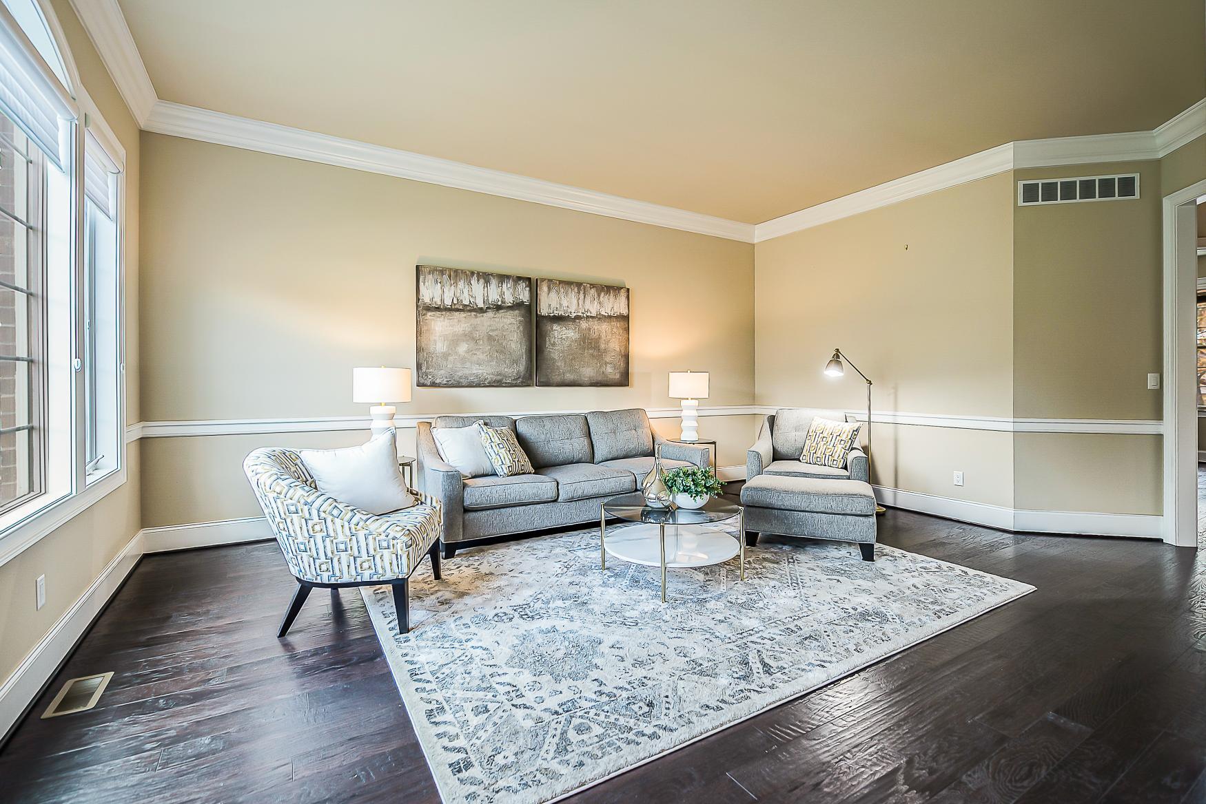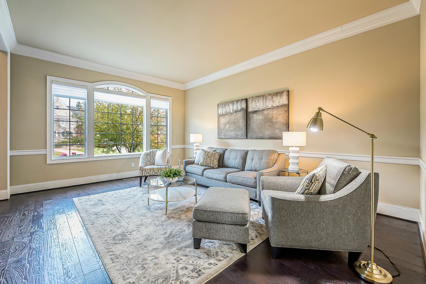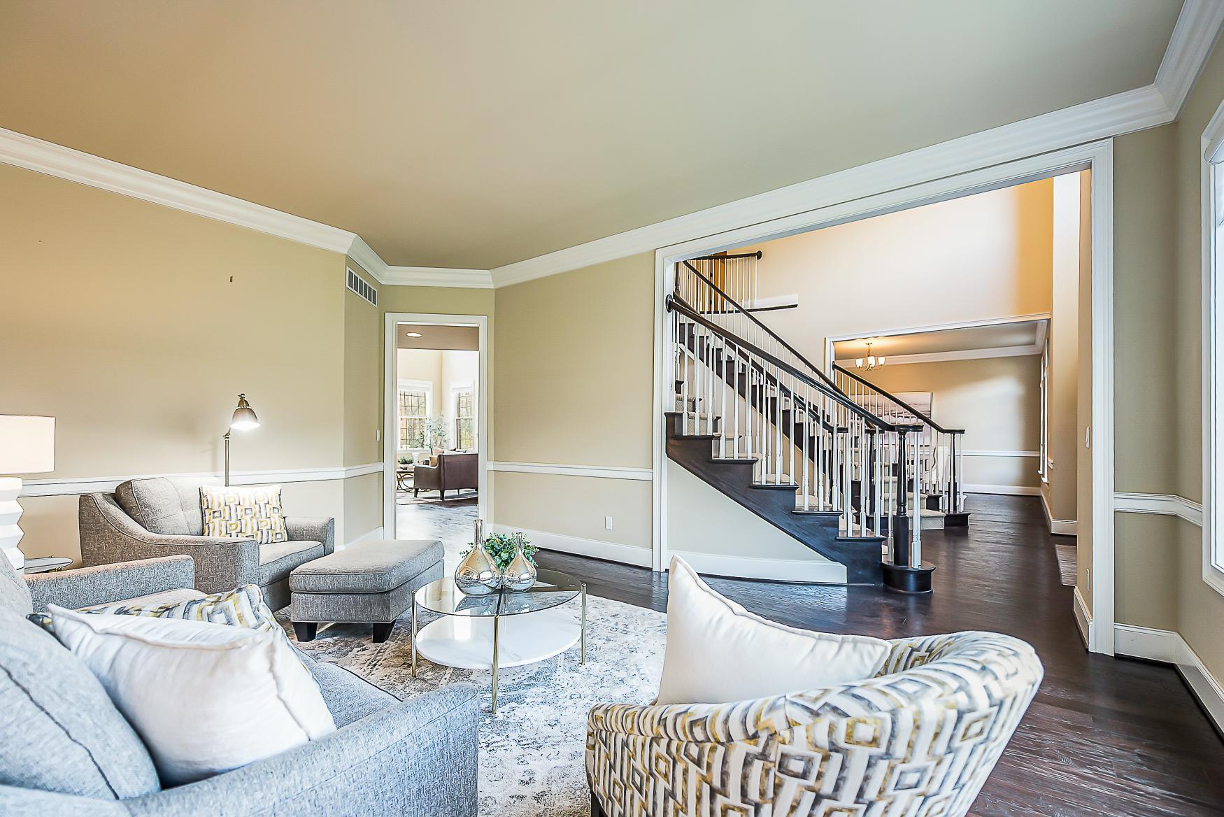 A breathtaking dual staircase greets you upon entry, setting a tone of grandeur that continues throughout. Rich hardwood floors flow across the main level, accented by stately architectural columns and intricate crown molding. The formal living room, bathed in natural light and detailed with classic chair rail molding, provides an ideal space for welcoming guests.