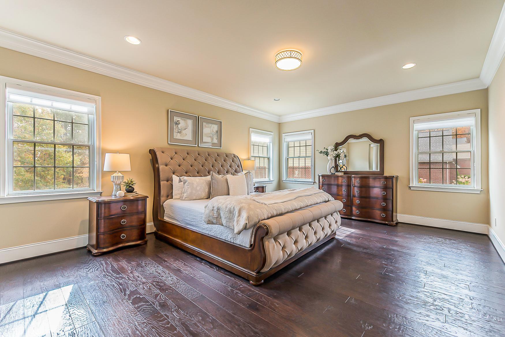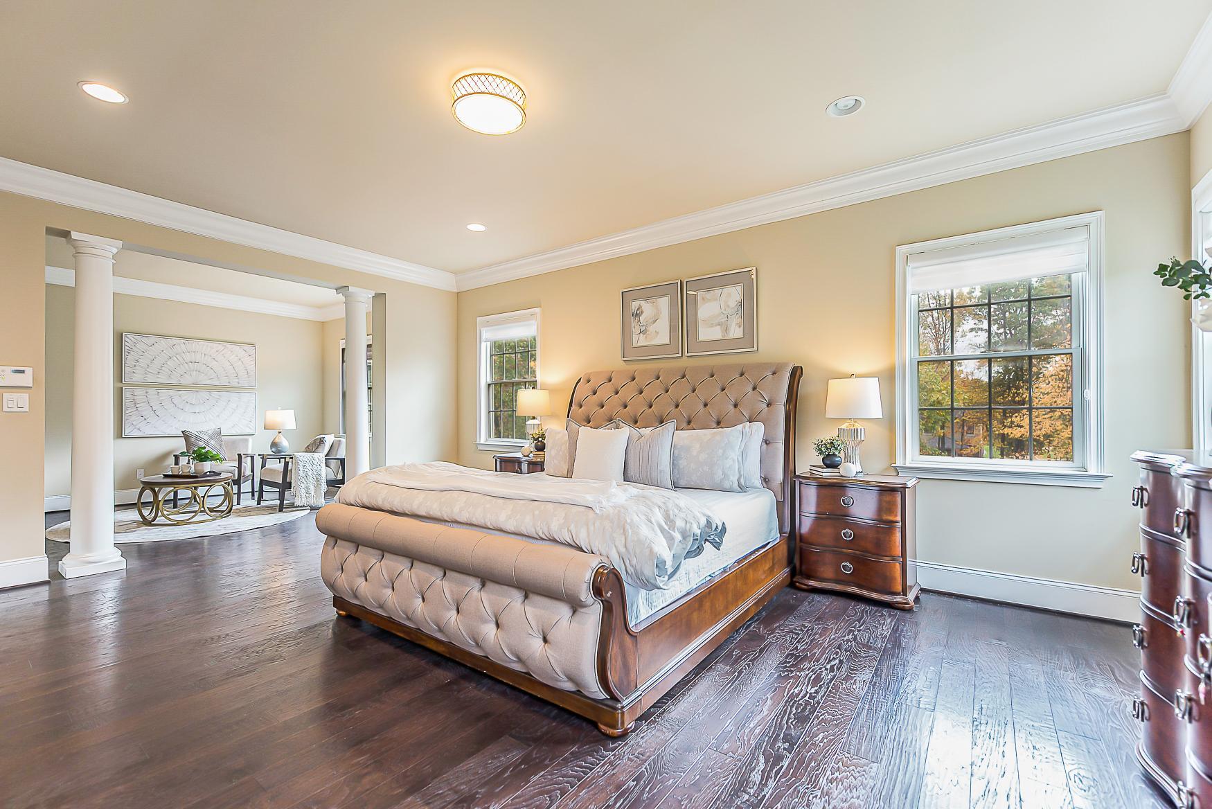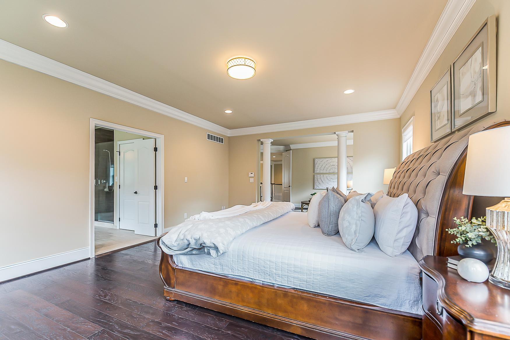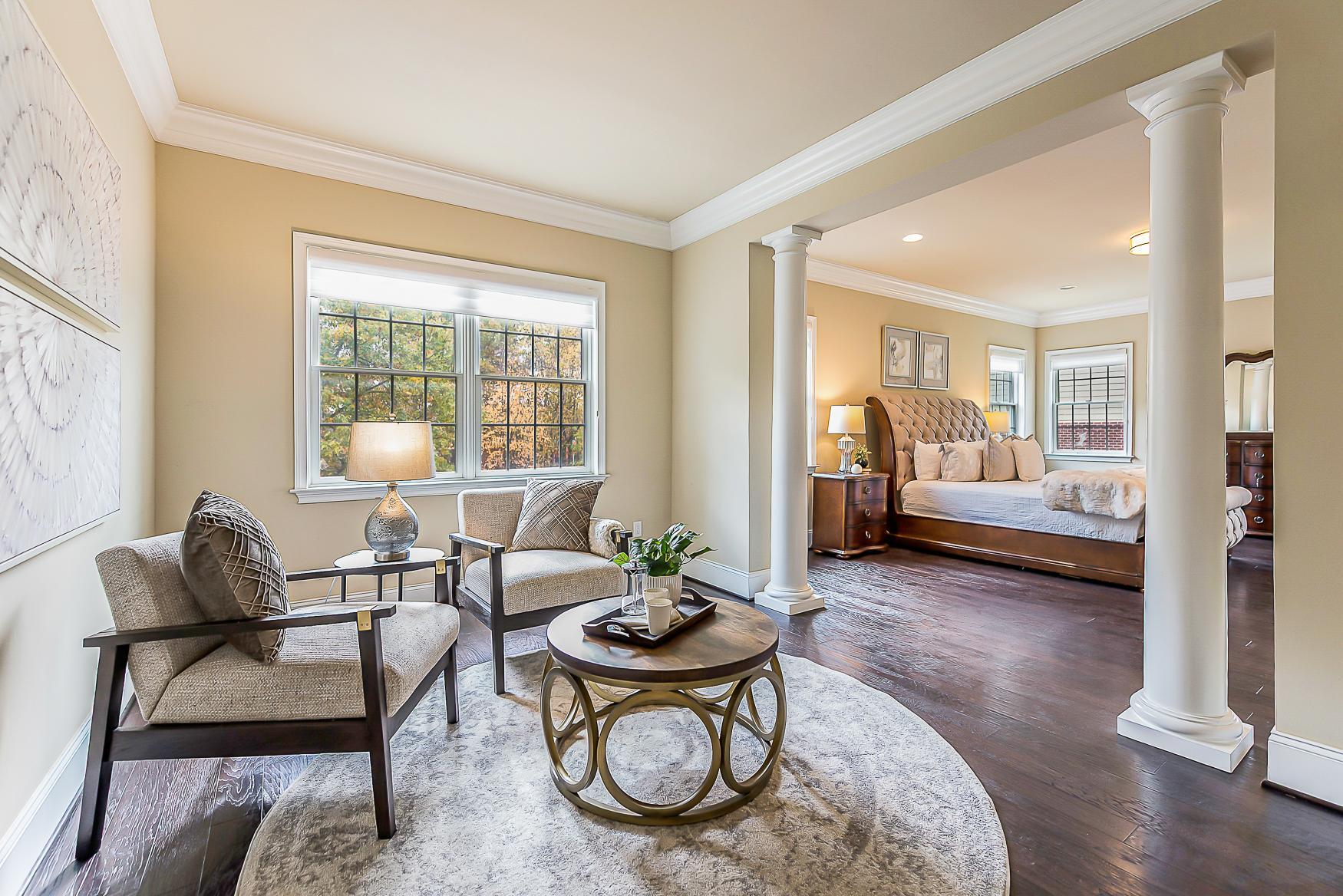 A breathtaking dual staircase greets you upon entry, setting a tone of grandeur that continues throughout. Rich hardwood floors flow across the main level, accented by stately architectural columns and intricate crown molding. The formal living room, bathed in natural light and detailed with classic chair rail molding, provides an ideal space for welcoming guests.