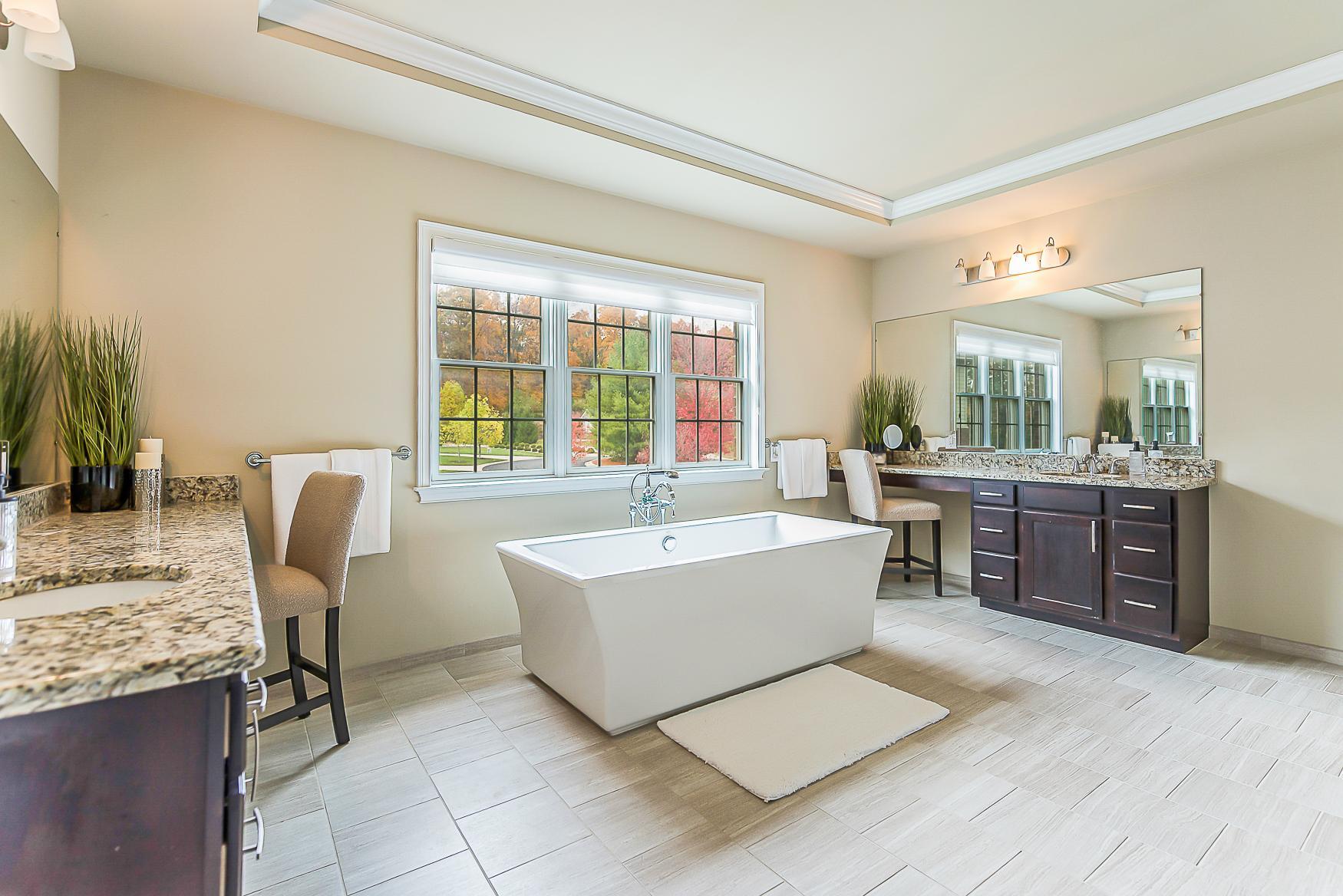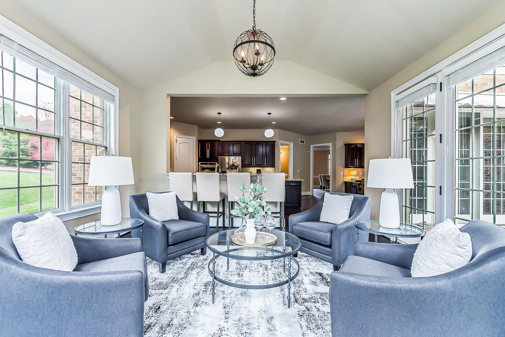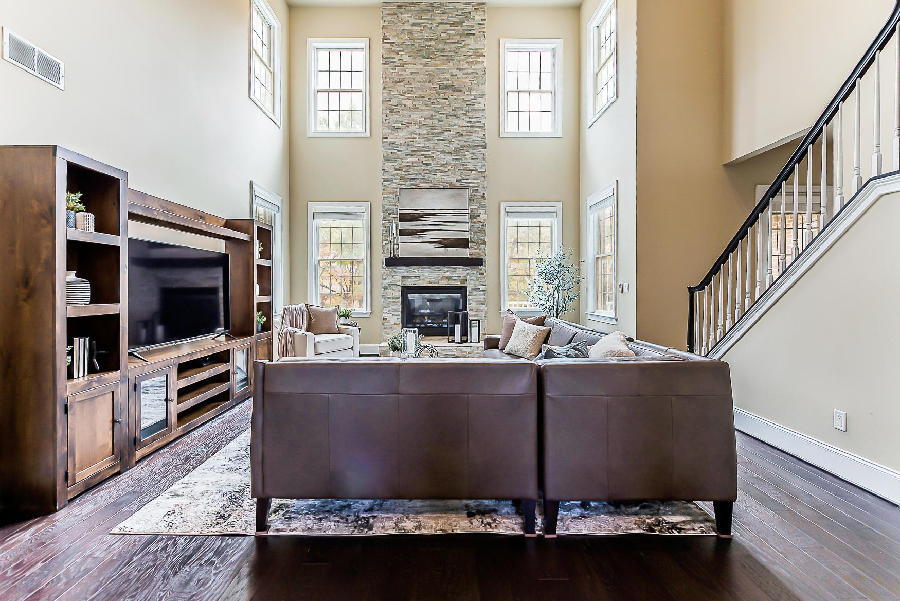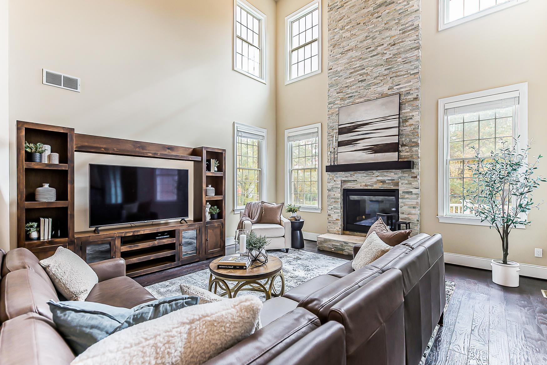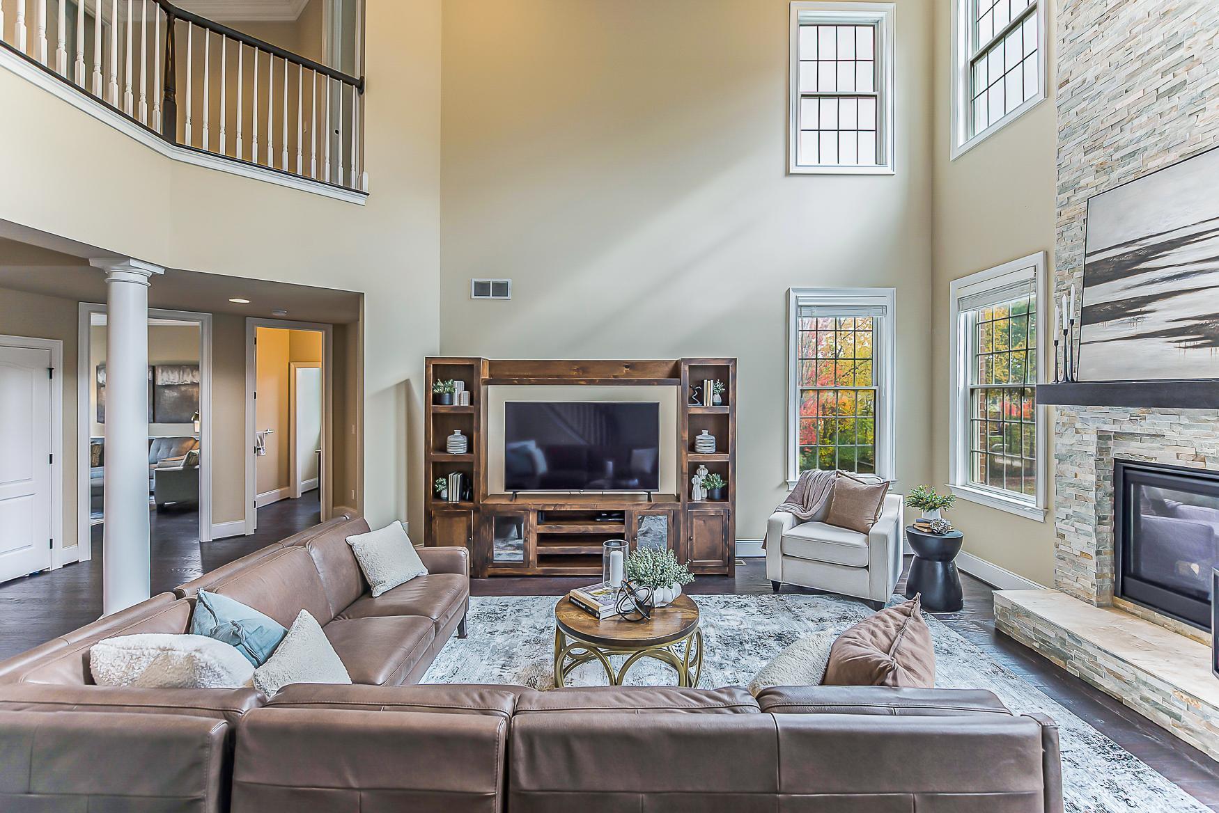 The heart of the home is the magnificent two-story great room. A dramatic stacked stone fireplace soars to the ceiling, while double-height windows on three sides fill the space with an airy, bright ambiance. A convenient second staircase provides additional access to the upper level.