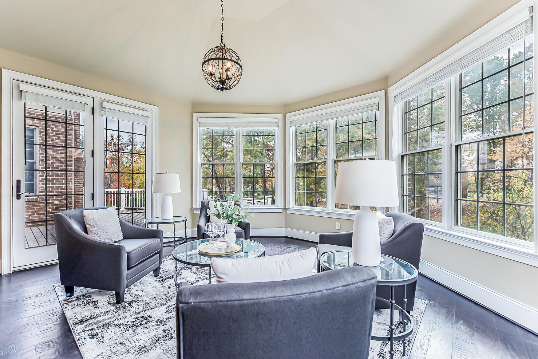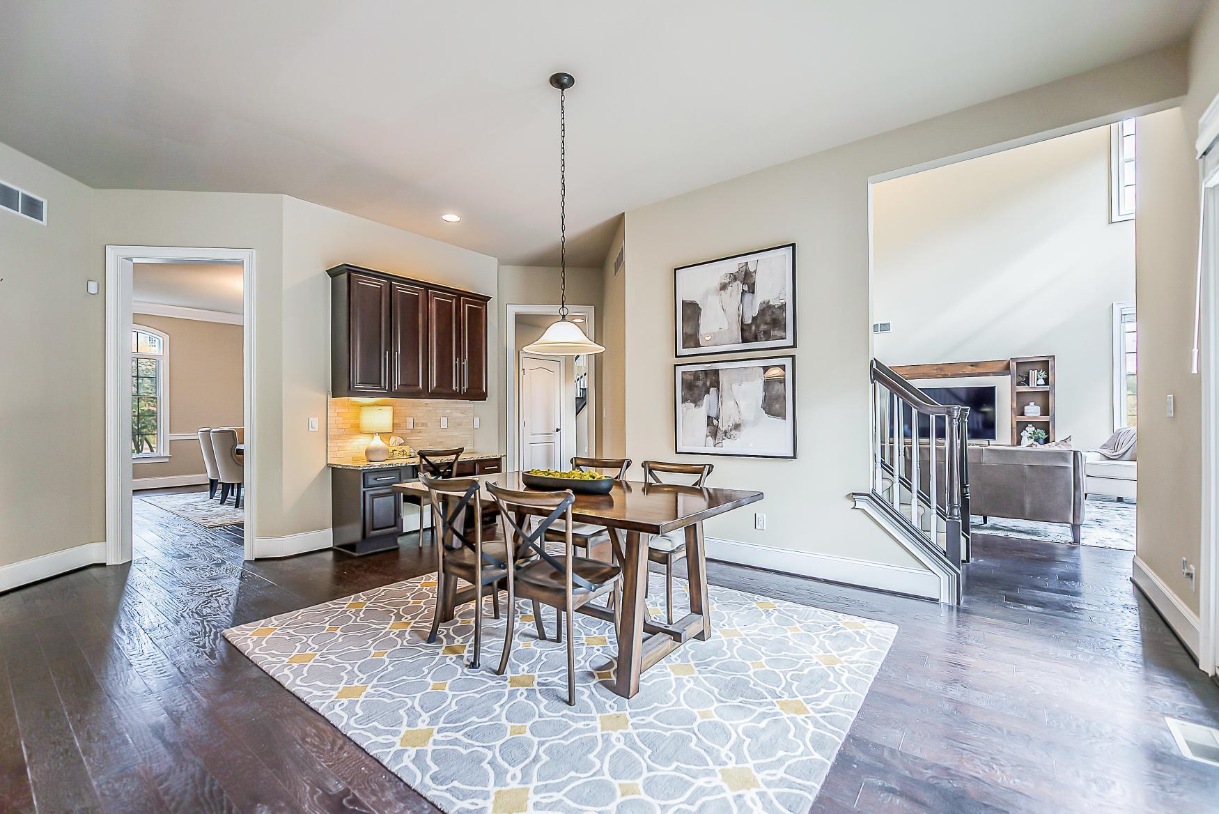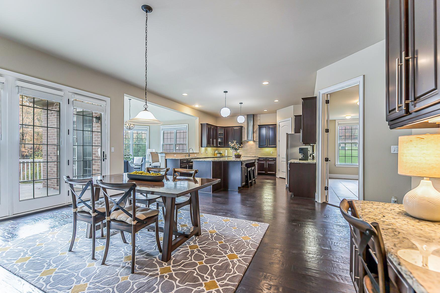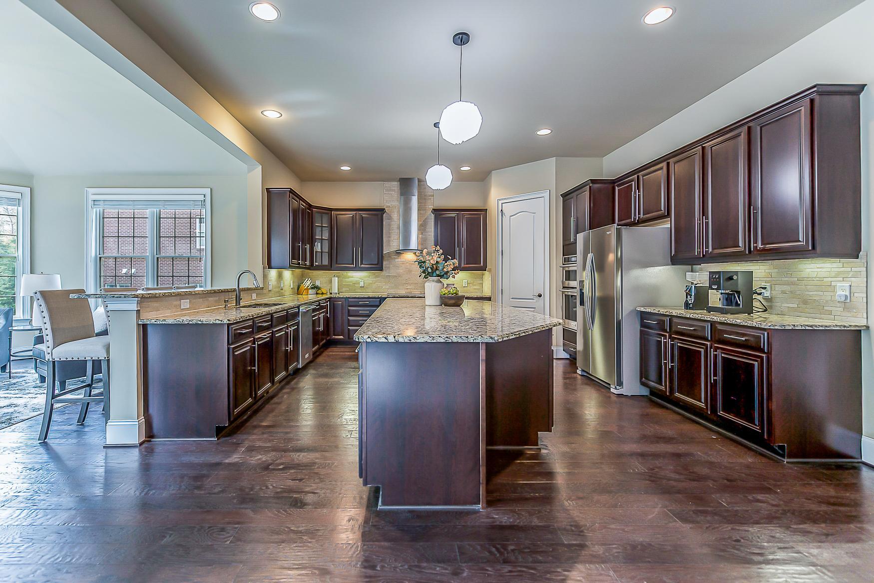 Designed for the ultimate host, the gourmet kitchen is a chef's dream. It features a large center island, granite countertops, rich cherry cabinets, a full suite of stainless-steel appliances, and a walk-in pantry. The adjoining eating area opens directly onto a spacious composite deck, complete with an automatic overhead canopy for perfect outdoor dining. Steps away, the sunroom invites relaxation with its vaulted ceilings and sun kissed glow. Host memorable dinners in the formal dining room, large enough for grand gatherings and elegantly appointed with crown and chair rail molding. A dedicated study with floor-to-ceiling built-in bookcases offers a quiet retreat for work or reading. Two half baths complete the expansive main level.