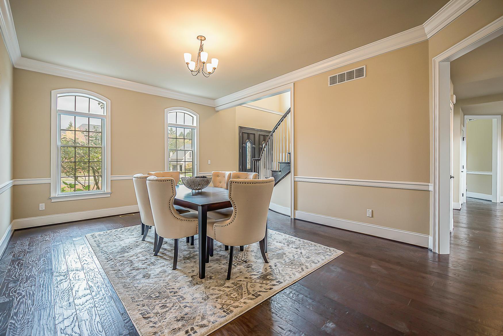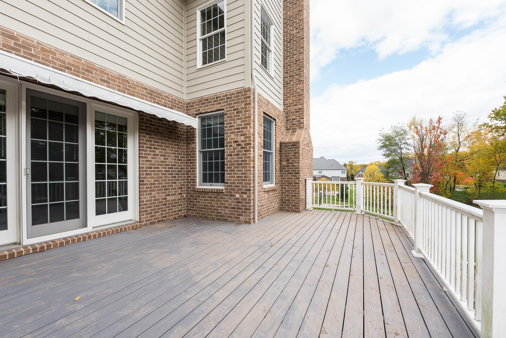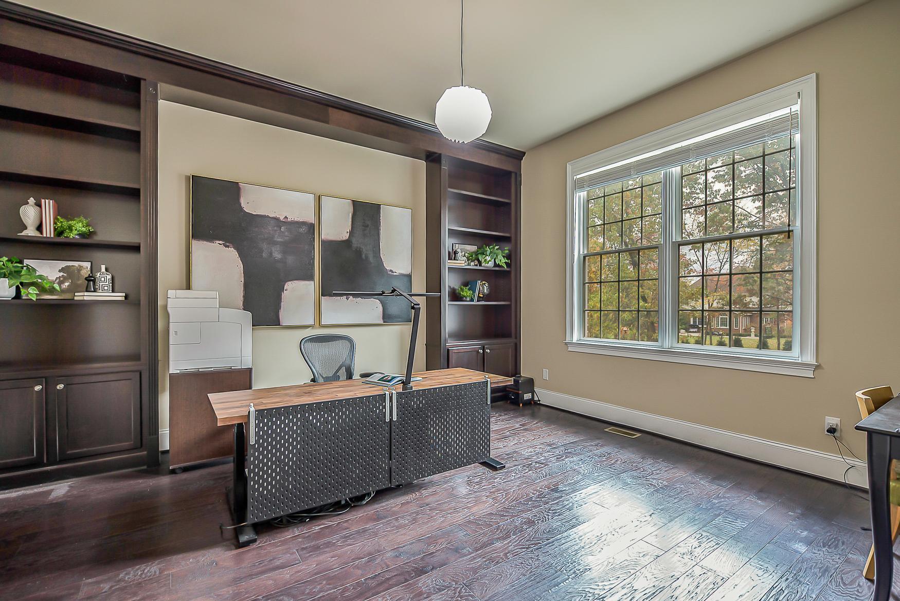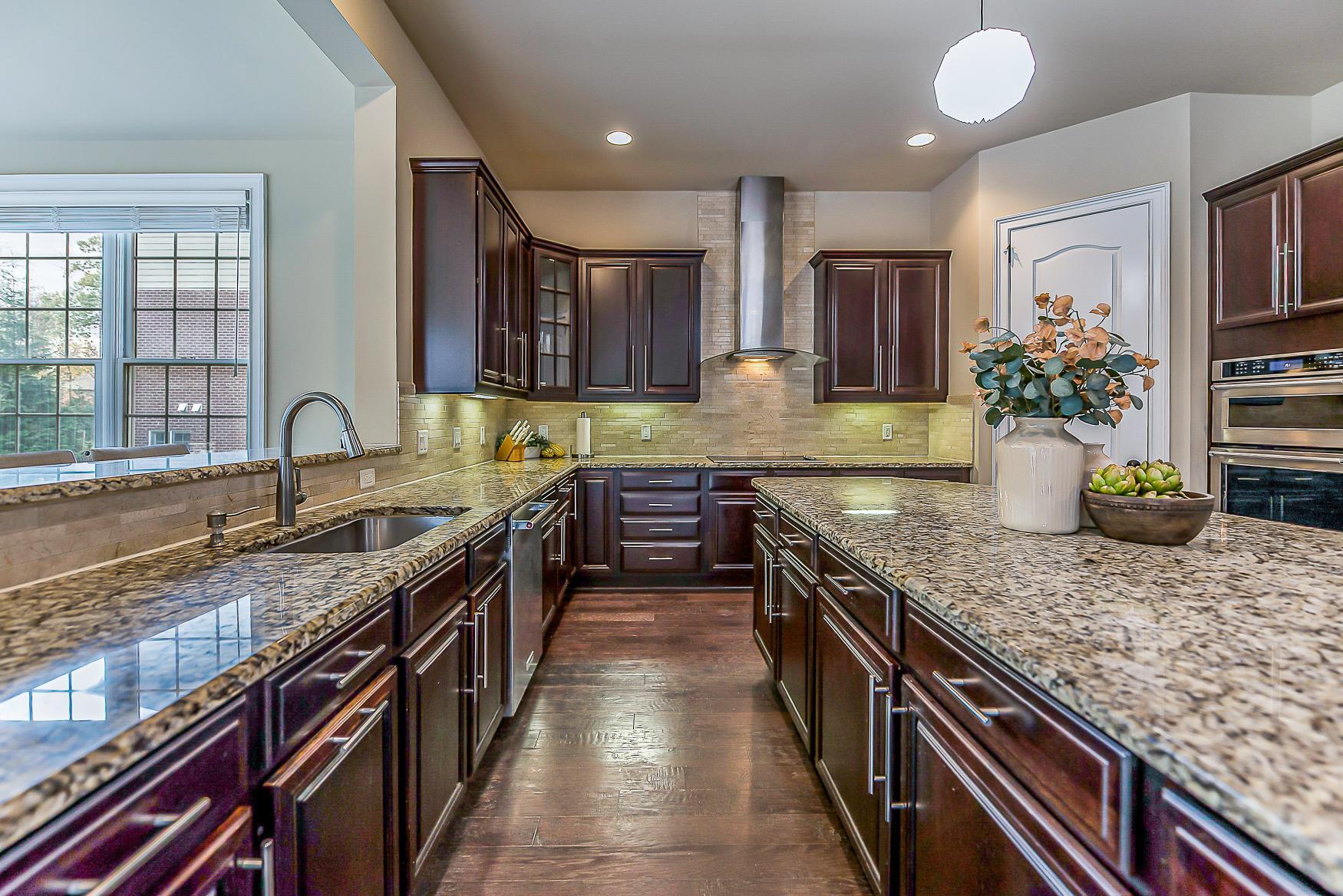 Designed for the ultimate host, the gourmet kitchen is a chef's dream. It features a large center island, granite countertops, rich cherry cabinets, a full suite of stainless-steel appliances, and a walk-in pantry. The adjoining eating area opens directly onto a spacious composite deck, complete with an automatic overhead canopy for perfect outdoor dining. Steps away, the sunroom invites relaxation with its vaulted ceilings and sun kissed glow. Host memorable dinners in the formal dining room, large enough for grand gatherings and elegantly appointed with crown and chair rail molding. A dedicated study with floor-to-ceiling built-in bookcases offers a quiet retreat for work or reading. Two half baths complete the expansive main level.