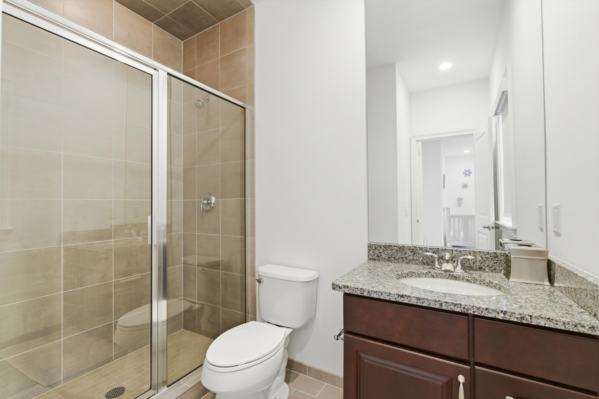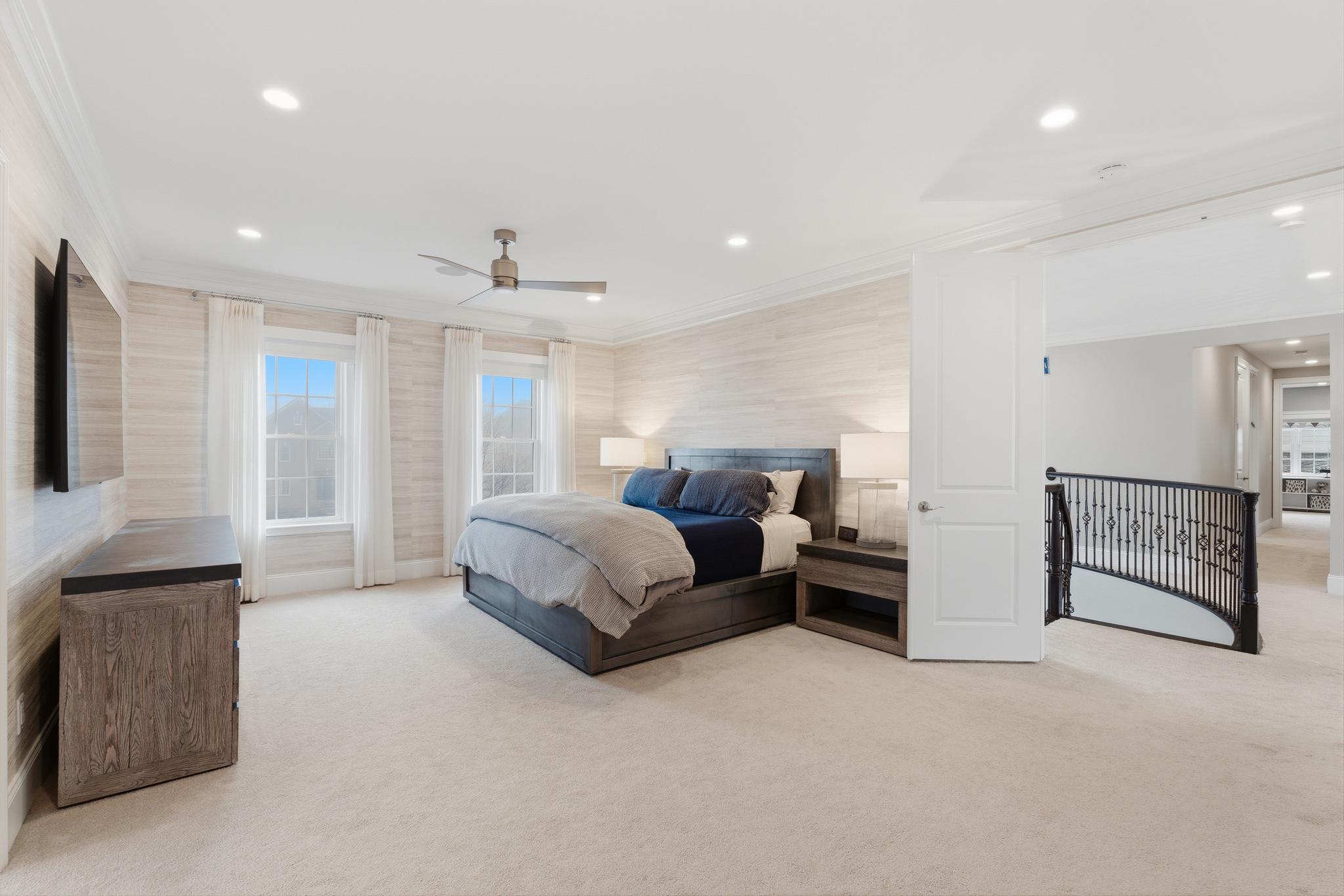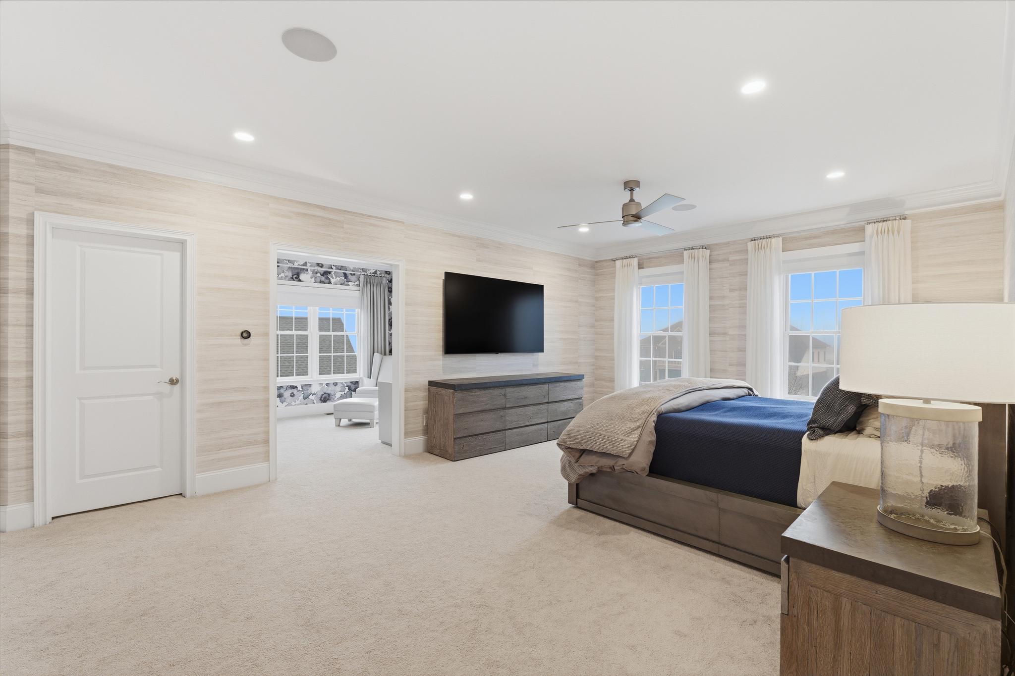 Upstairs, the luxurious primary suite offers a true sanctuary. Behind double doors, you will find dual walk-in closets with custom shelving, a private sitting room, and motorized shades. The spa-like en-suite bath features an oversized shower, a separate whirlpool tub, and double vanities with granite countertops. The second floor also includes two bedrooms connected by a Jack-and-Jill bath, a fourth en-suite bedroom, and a dedicated laundry room.