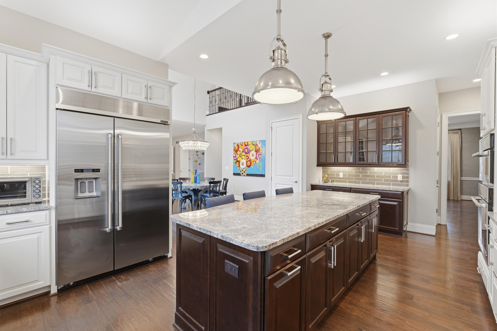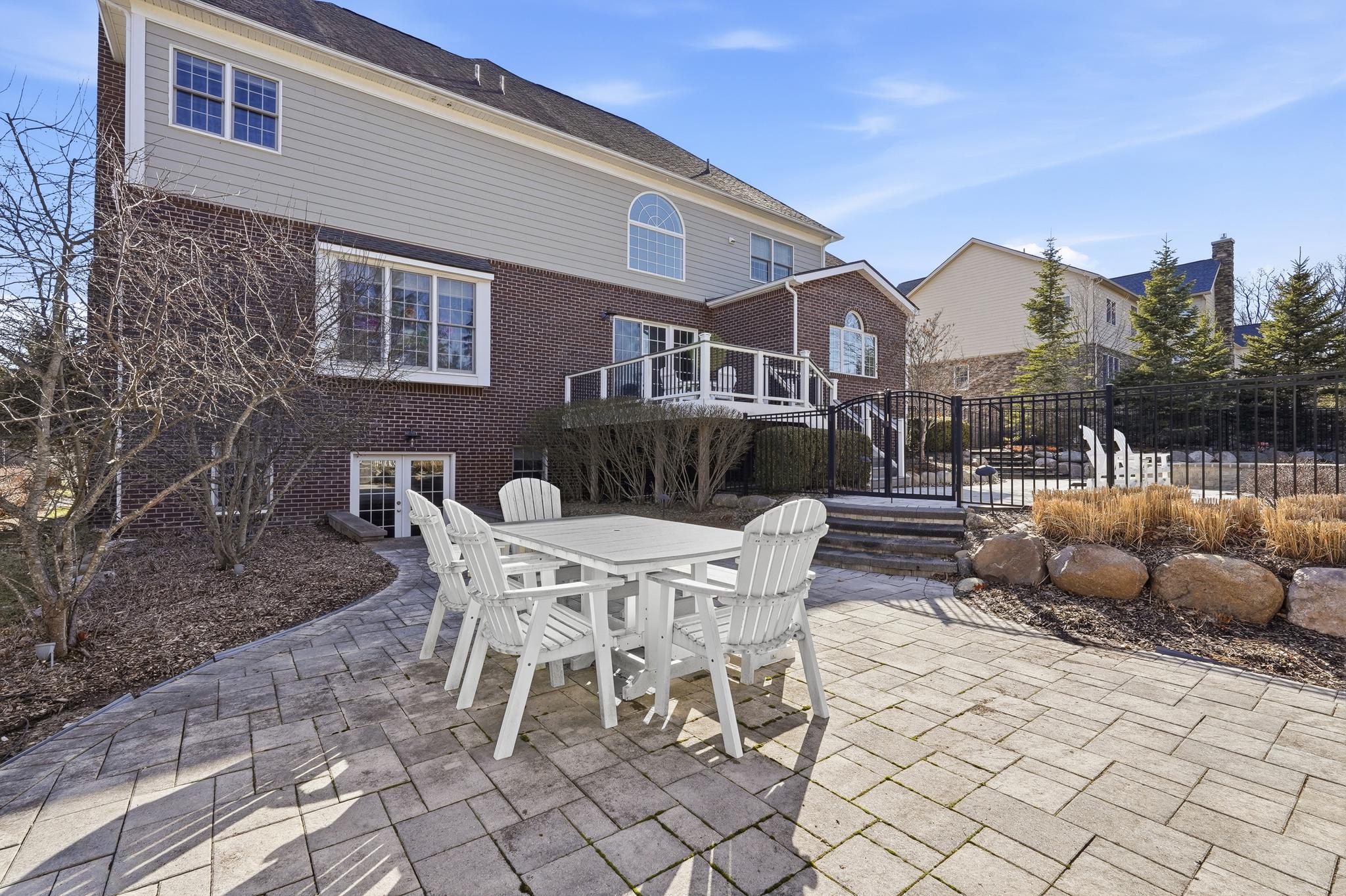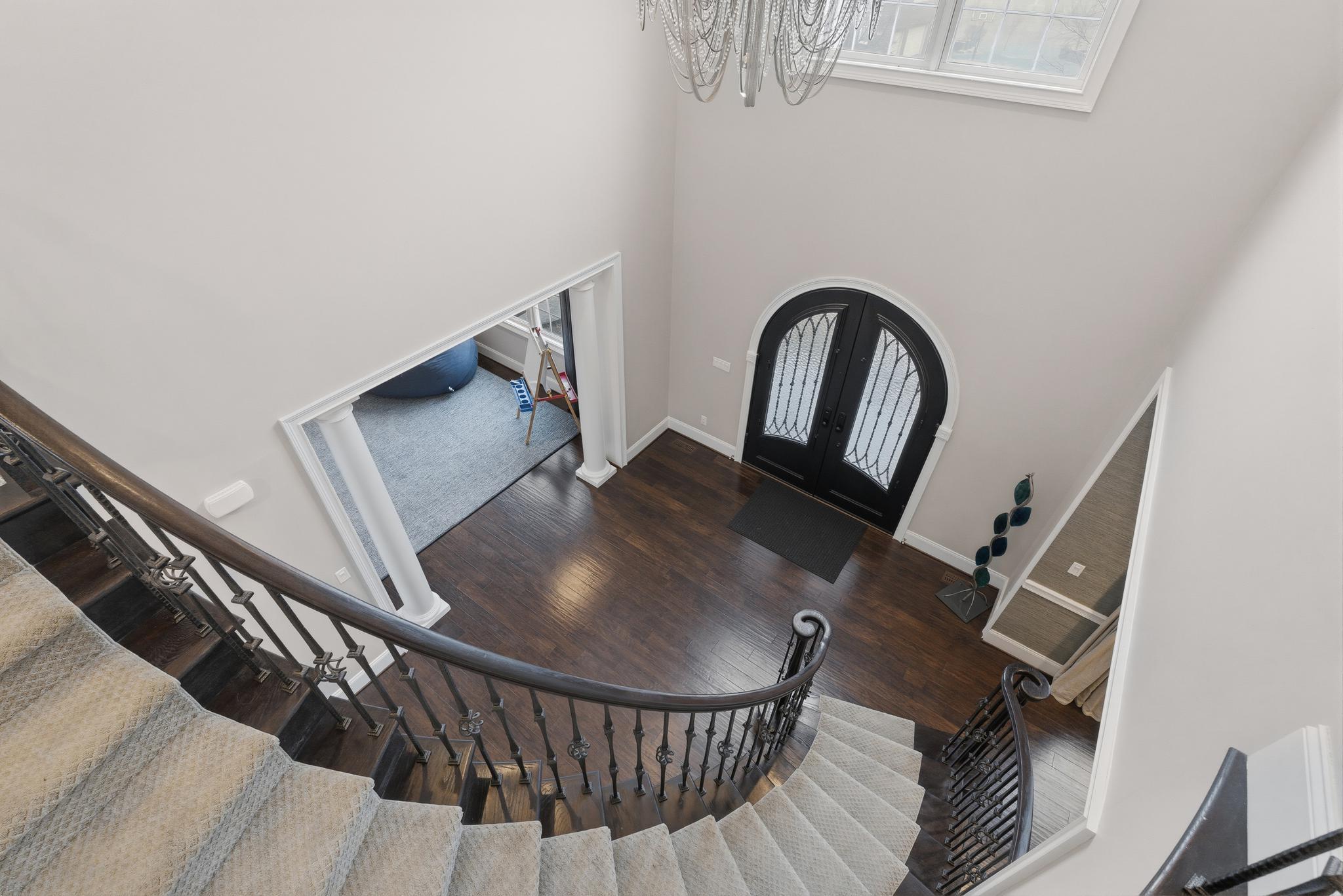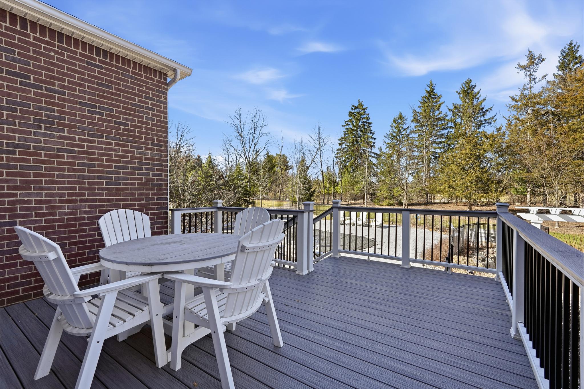 Inside, a grand two-story foyer with a sweeping curved staircase welcomes you. The layout flows gracefully into a large formal dining room. Double doors reveal a comfortable family room anchored by a stunning floor-to-ceiling stone fireplace. The chef-inspired Palladian kitchen offers a massive granite island and high-end Jenn-Air appliances, including dual dishwashers and a double oven. An oversized pantry and a bright breakfast nook open directly to a beautiful Trex deck. A private main-floor study provides the perfect quiet space to work from home.