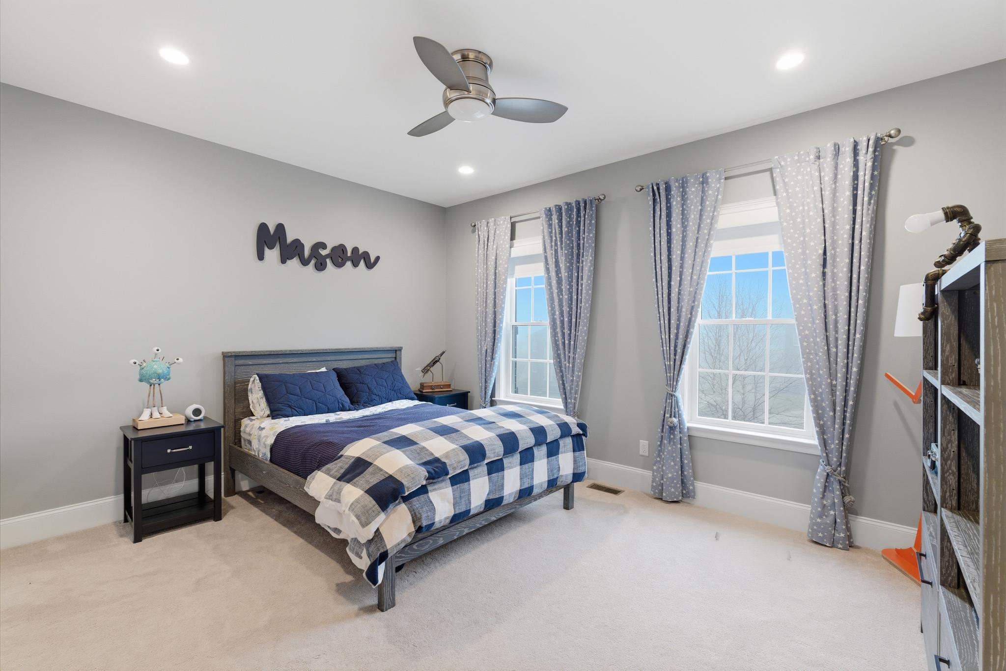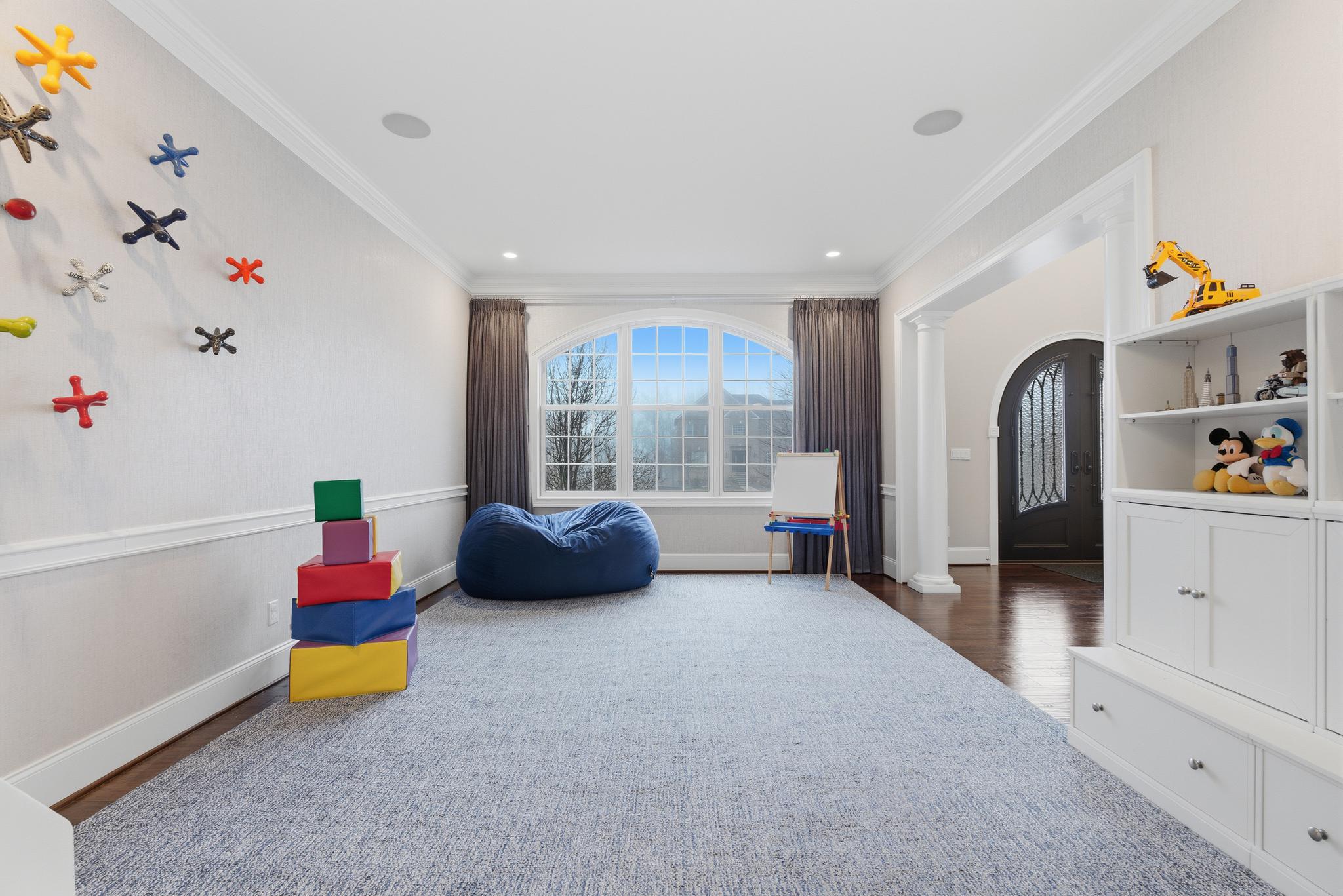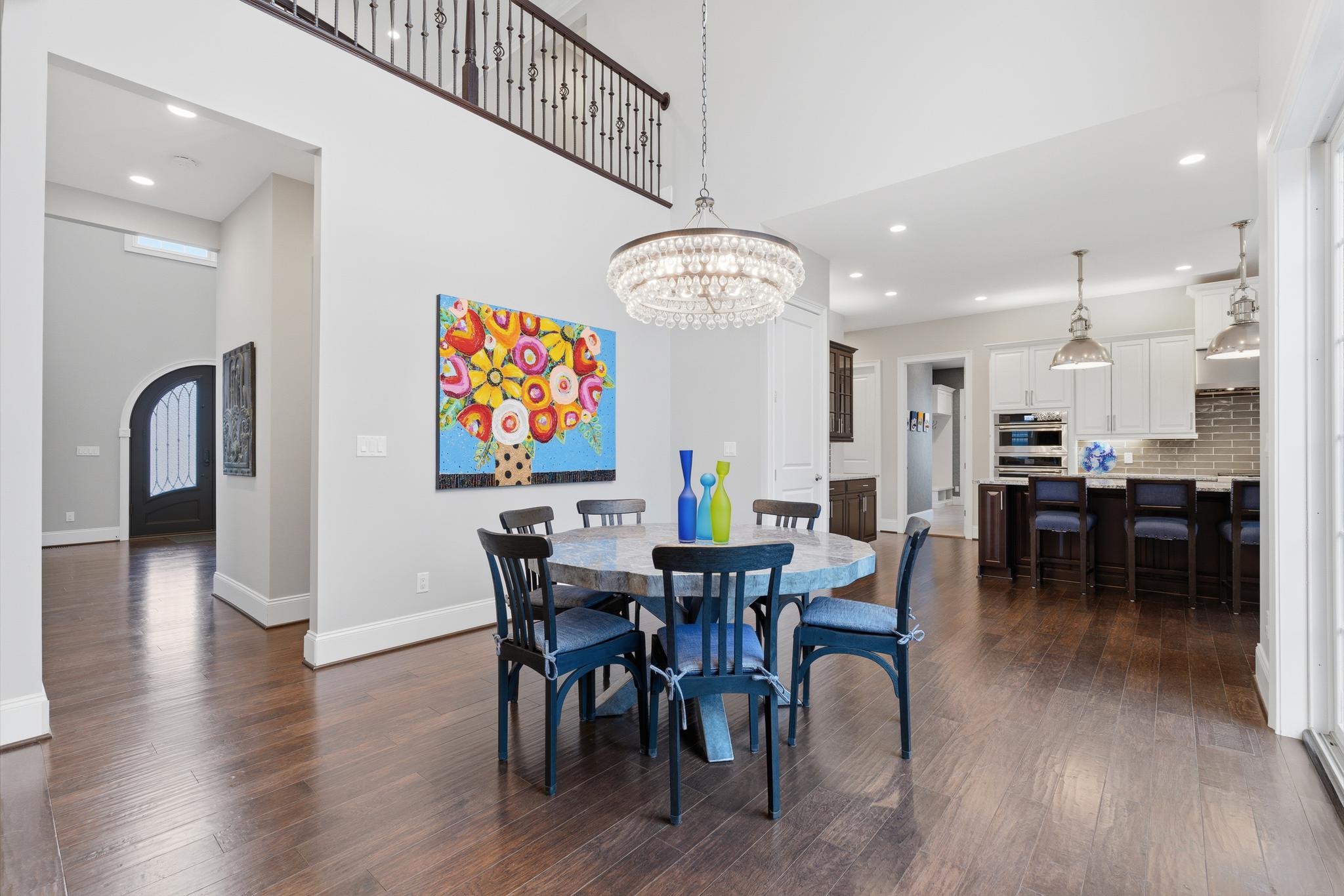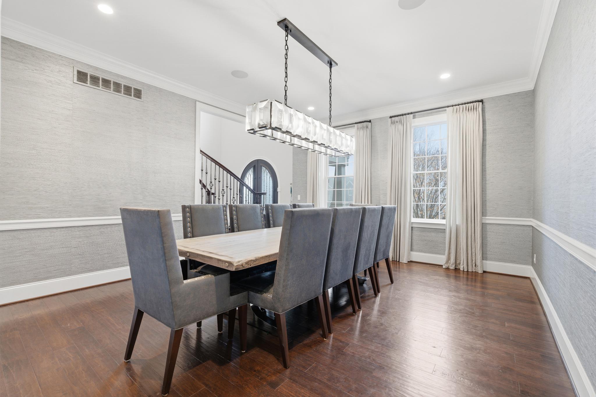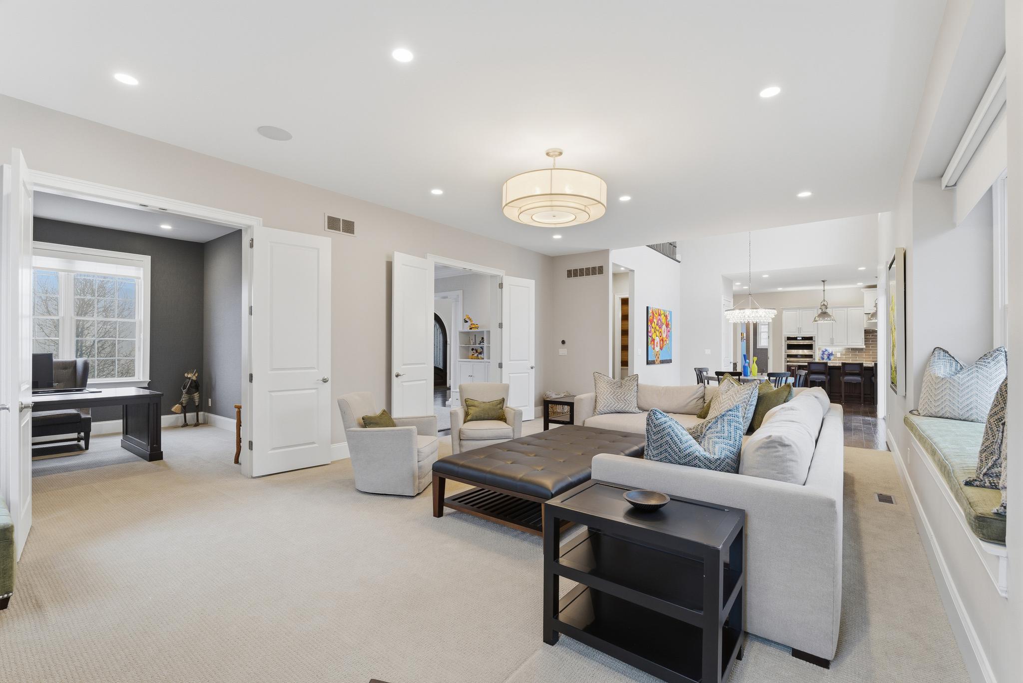 Inside, a grand two-story foyer with a sweeping curved staircase welcomes you. The layout flows gracefully into a large formal dining room. Double doors reveal a comfortable family room anchored by a stunning floor-to-ceiling stone fireplace. The chef-inspired Palladian kitchen offers a massive granite island and high-end Jenn-Air appliances, including dual dishwashers and a double oven. An oversized pantry and a bright breakfast nook open directly to a beautiful Trex deck. A private main-floor study provides the perfect quiet space to work from home.