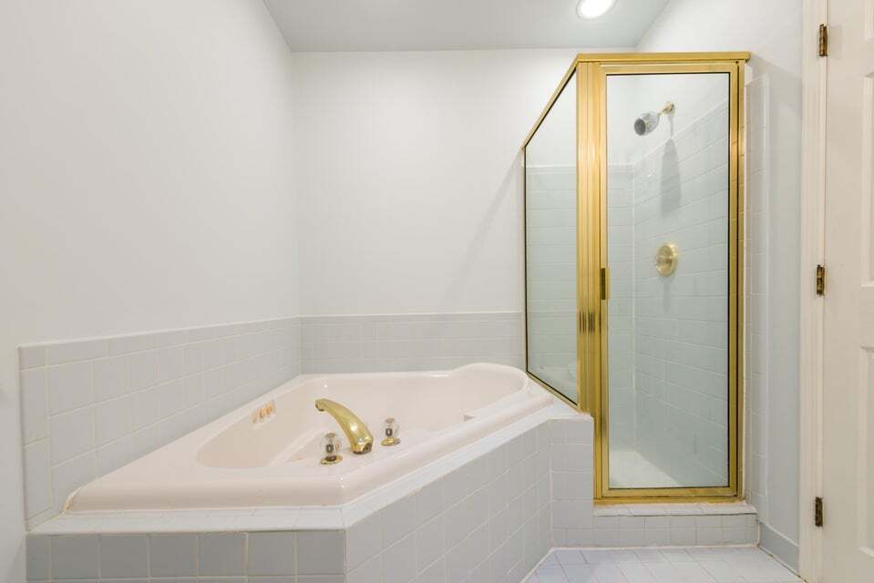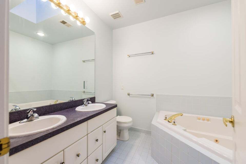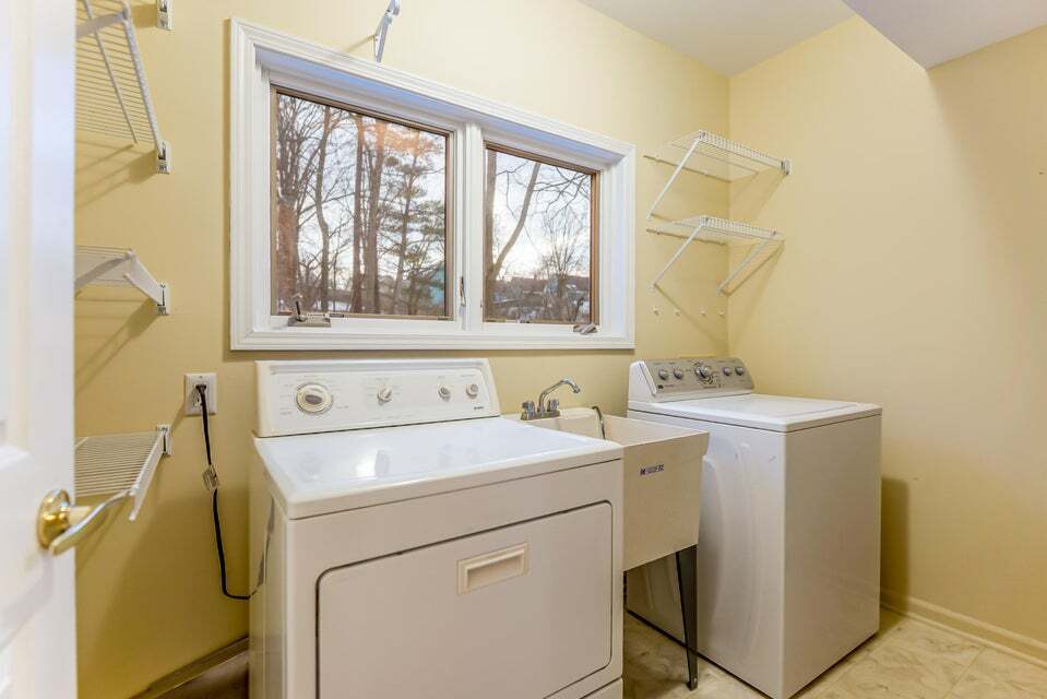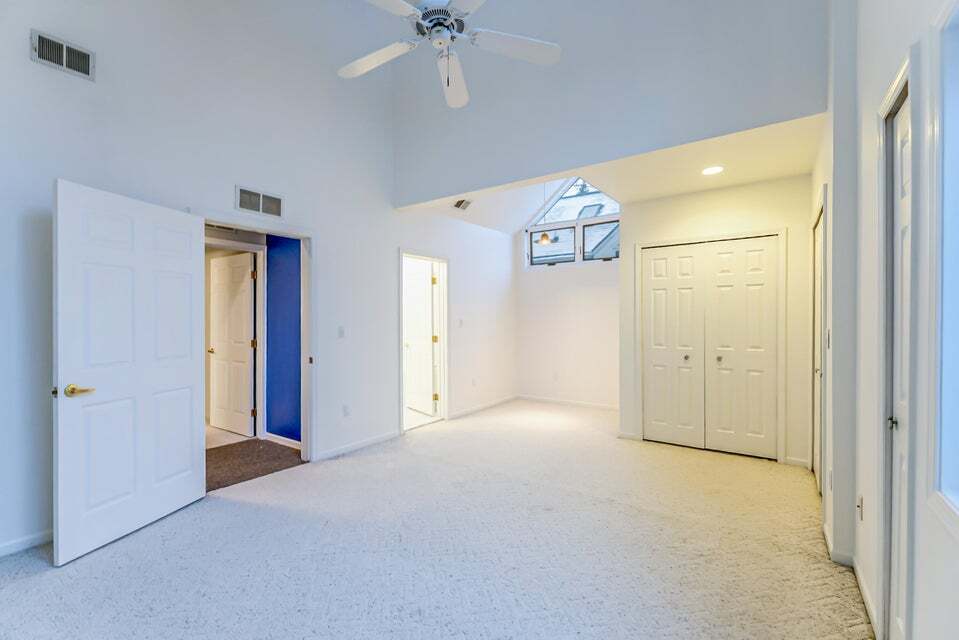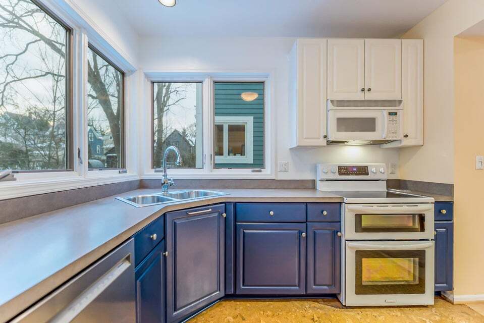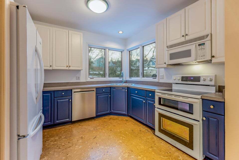 The bright kitchen exudes charm, with cork flooring, ample pantry space, and picturesque views of the verdant backyard. A half bath and a convenient full laundry room with a utility sink are also located on the main level. Upstairs, the soaring cathedral ceilings in the primary bedroom create an airy, open feel, while the ensuite bath offers a dual sink vanity, a spa tub, and a separate tiled shower. A junior primary suite with its own walk-in closet and ensuite bath provides a perfect space for guests or family members.