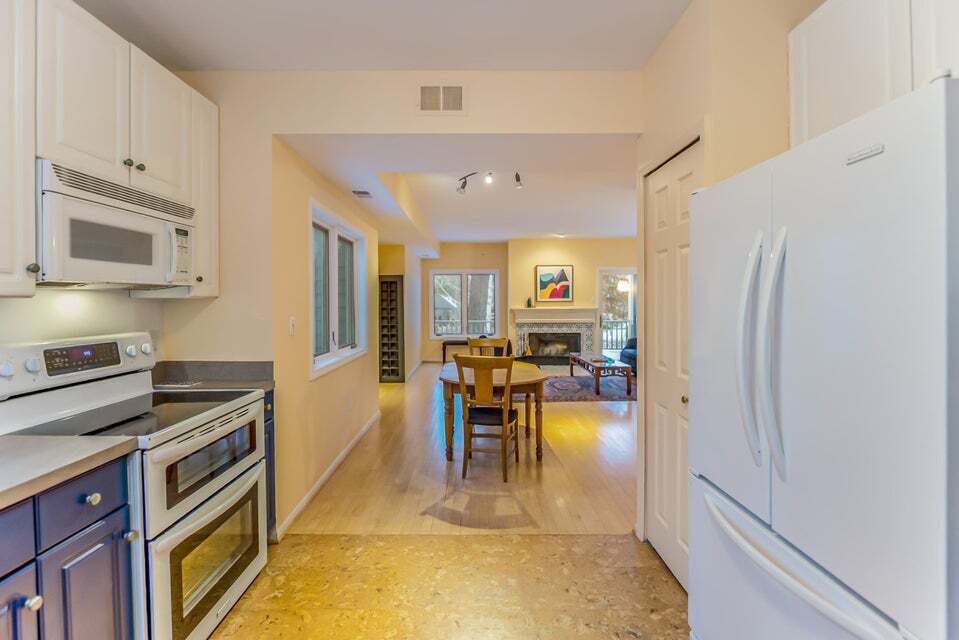 This 2-bedroom, 2.5-bath condo boasts an open floor plan thoughtfully designed for modern living. Upon entry, you’ll be greeted by beautiful maple hardwood floors on the main level and large windows in every room, filling the home with abundant natural light. The inviting living room features a stunning wood-burning fireplace with hand-picked Turkish tile surround, perfect for cozy winter evenings, and opens to a spacious covered balcony where you can relax and enjoy the private park-like setting.