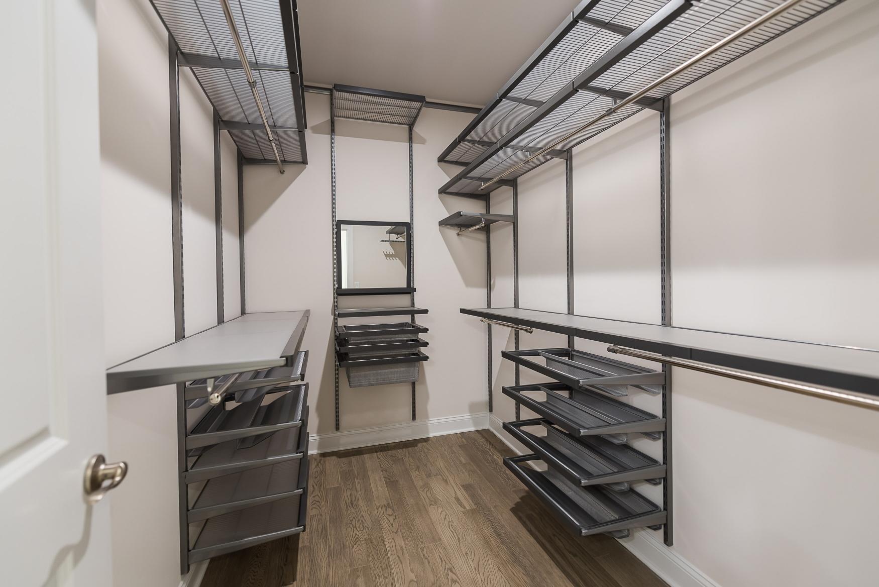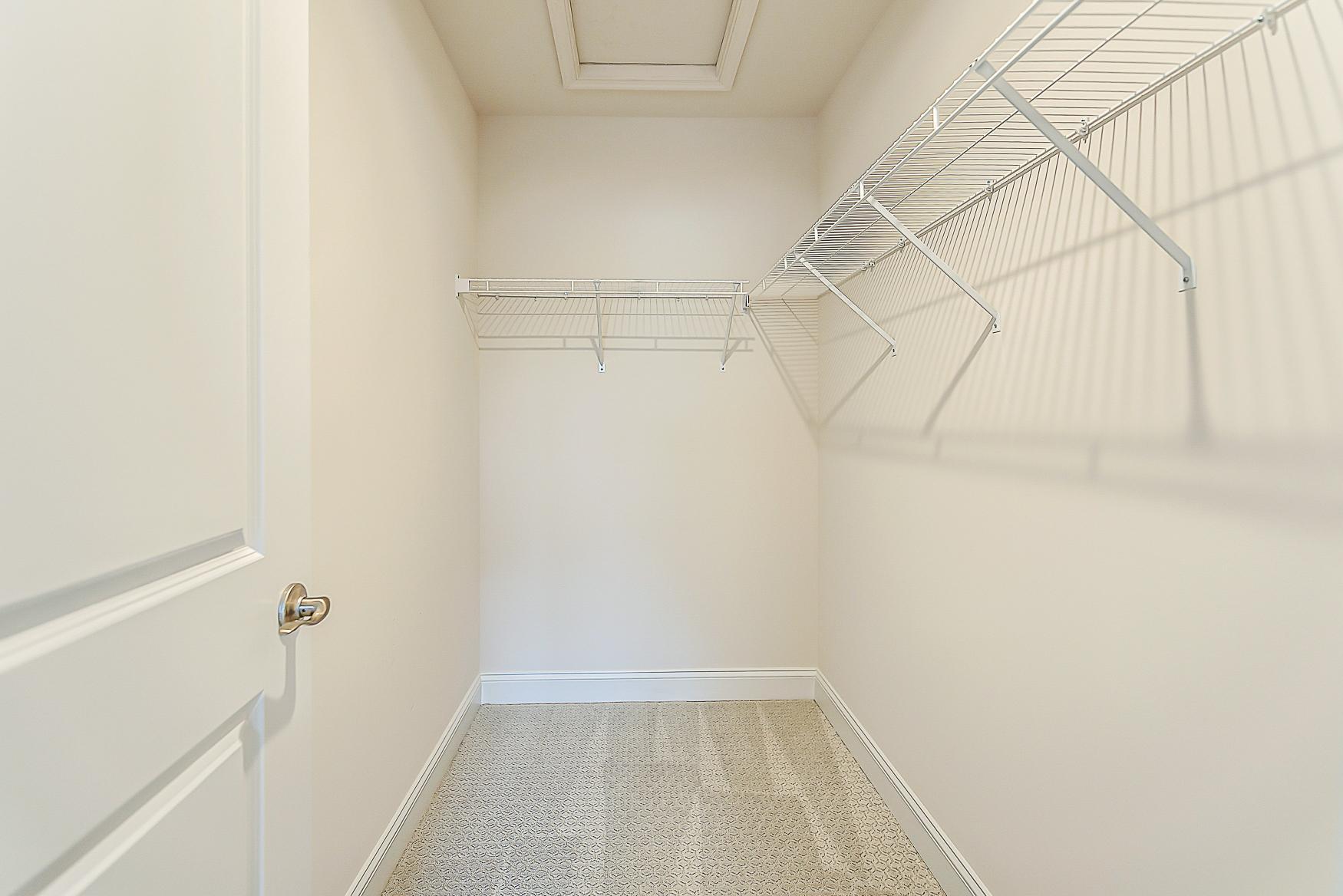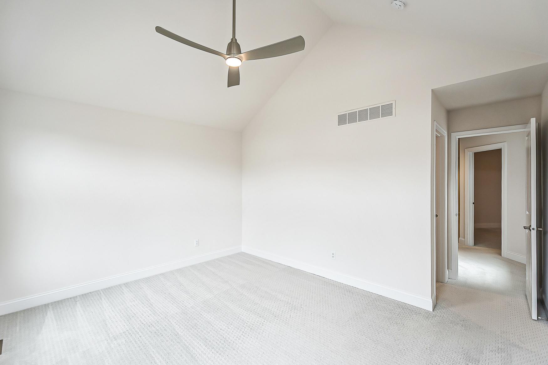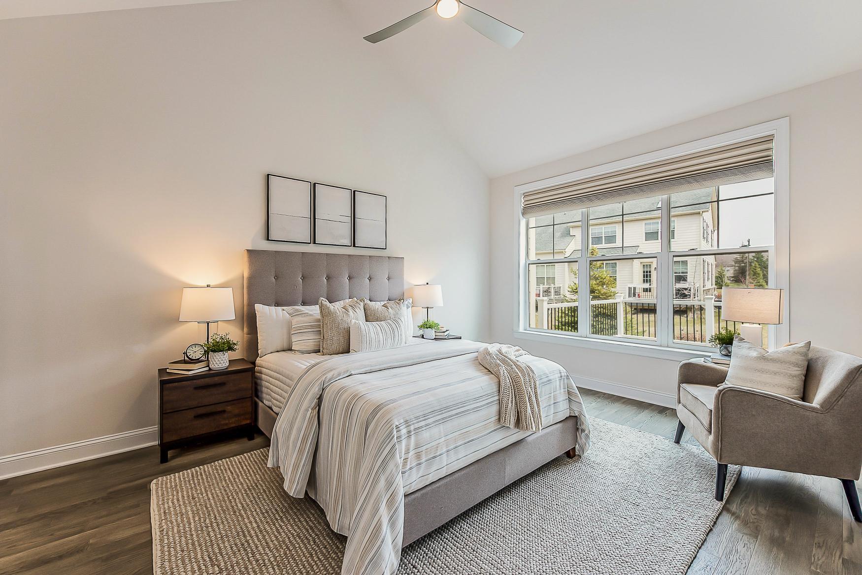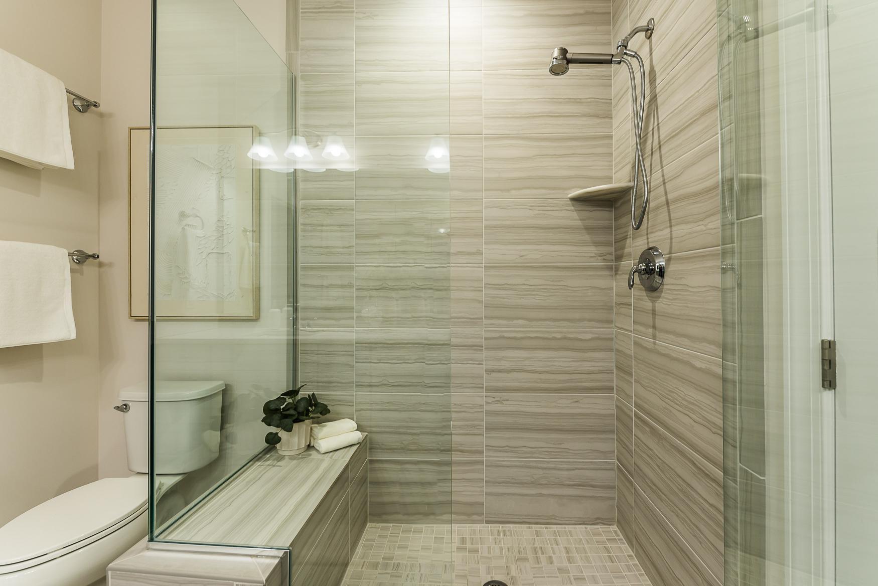 The first-floor primary suite is a true retreat, featuring a vaulted ceiling, a professionally organized walk-in closet, and a spa-like ensuite bath with a dual-sink vanity and a luxurious shower with a built-in seat.