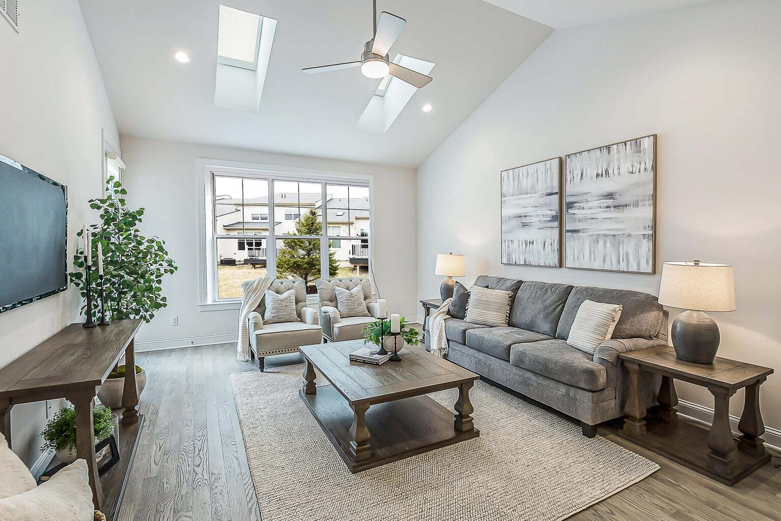 Step inside to be greeted by gleaming hardwood floors that flow seamlessly through the main living areas, creating a warm and inviting ambiance. The entryway opens to a versatile dining room, which can also serve as a library or home office. At the heart of the home is a chef-inspired gourmet kitchen, beautifully appointed with white cabinetry, a striking tiled backsplash, quartz countertops, and stainless-steel appliances. The kitchen also boasts a spacious pantry and a large center island with a breakfast bar, perfectly blending style and functionality. Adjacent to the kitchen, the magnificent great room impresses with its vaulted ceiling, skylights with motorized shades, and a doorway leading to a private deck.