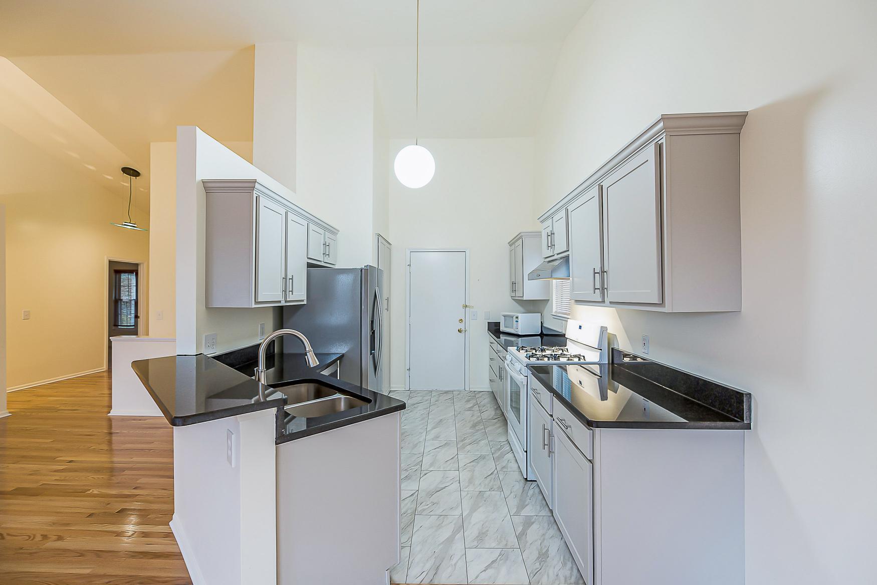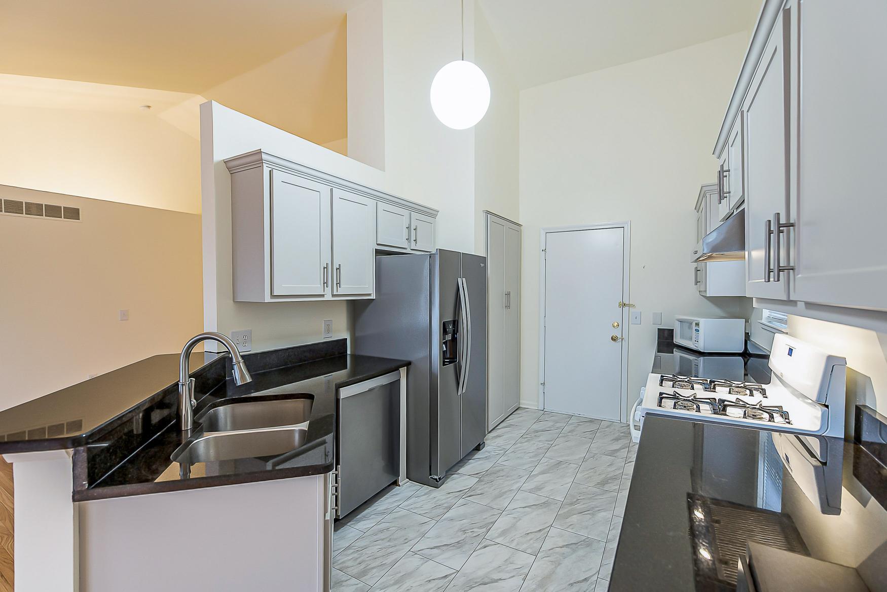 The adjacent galley-style kitchen features sleek black granite countertops, transitional shaker cabinets topped with crown molding, and a tiled floor. A practical breakfast bar and dedicated pantry complete the space, making meal preparation simple.