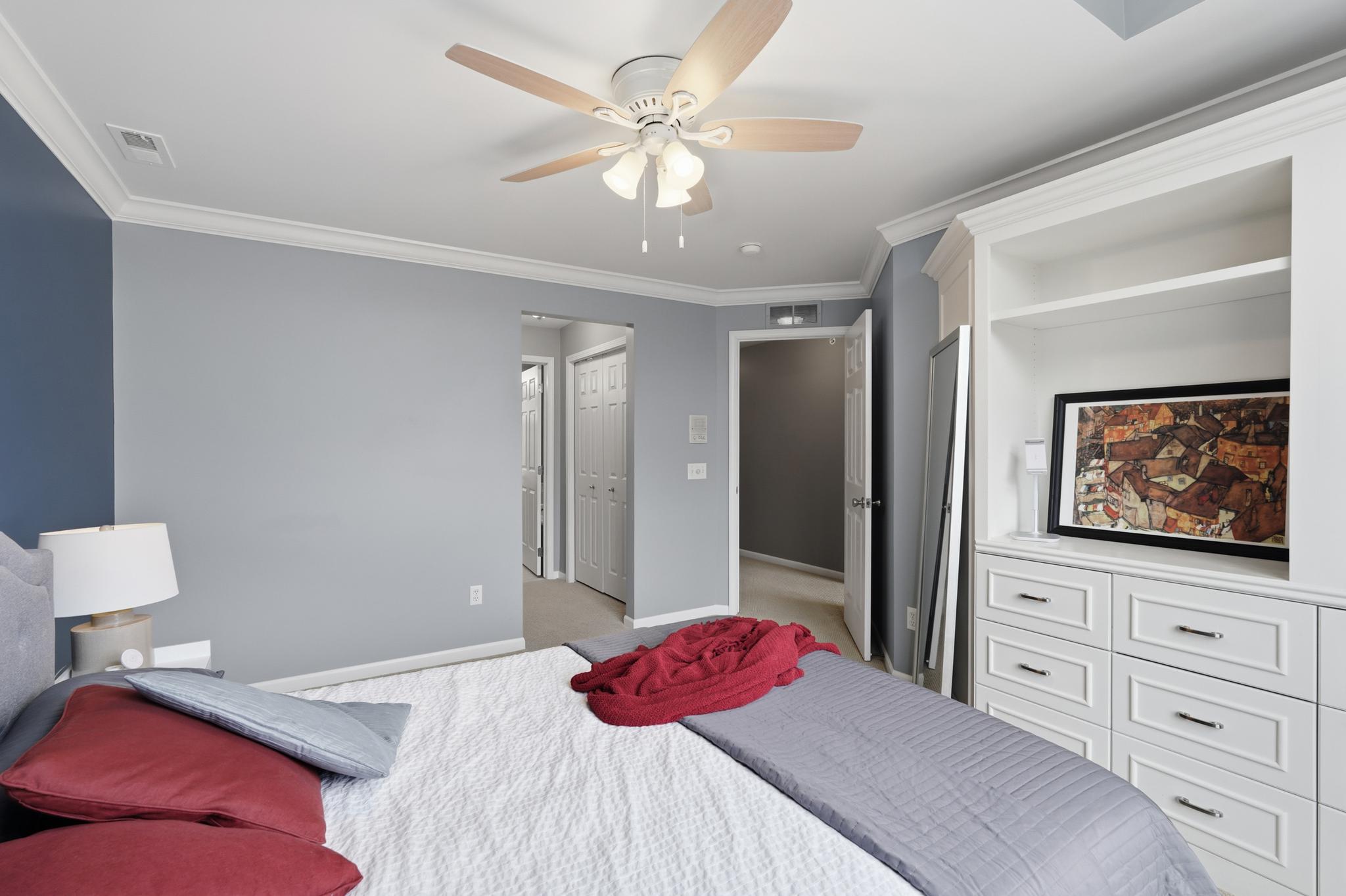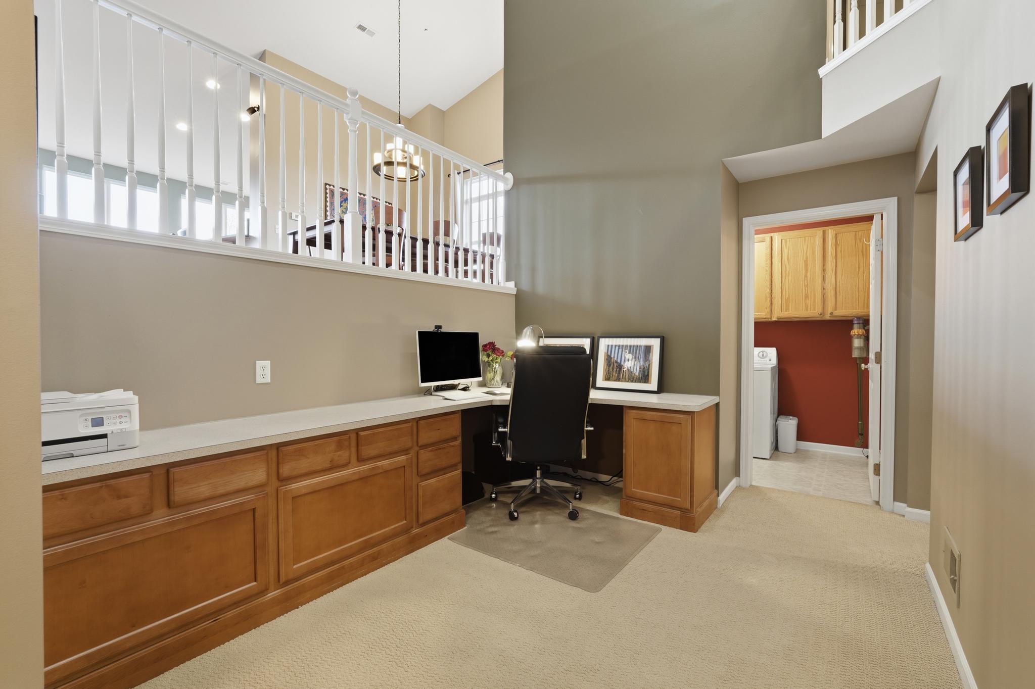 Tucked away on an offset lower level, you will find the primary suite, designed as a true retreat, with a walk-in closet and a spa-like ensuite bath featuring a relaxing soaking tub, a separate shower, and a dual-sink vanity. This level also hosts a second junior suite, a dedicated laundry room, a half bath, and a built-in home office area to keep your work organized and out of sight.