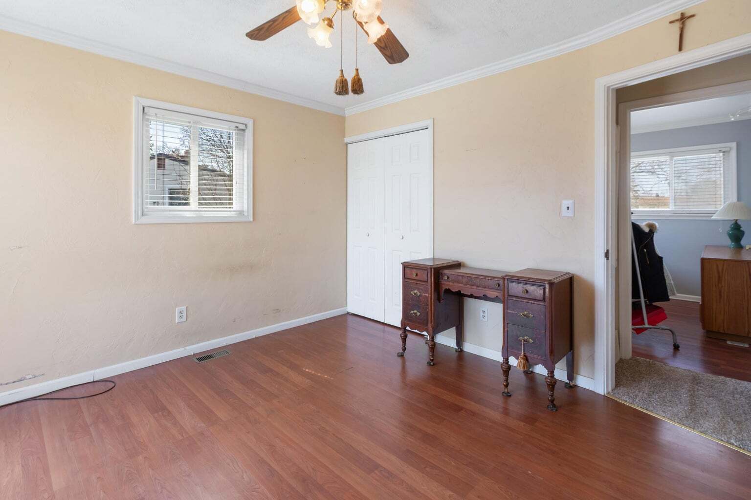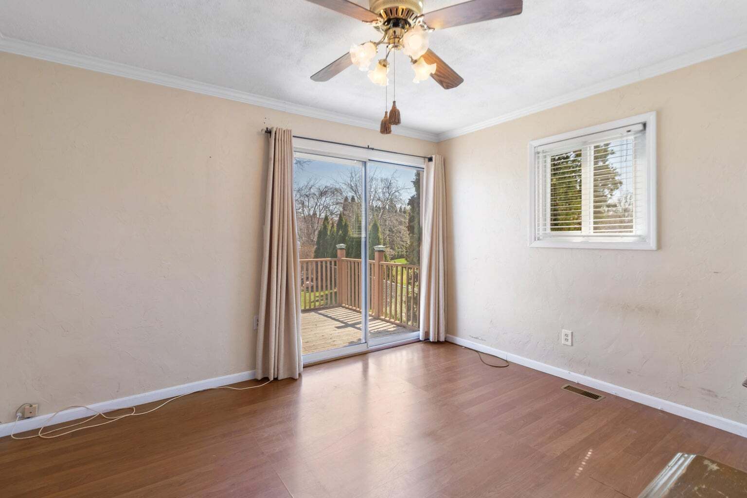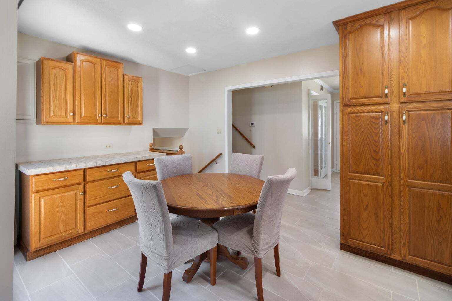 Welcome to this beautifully updated tri-level home tucked away in a quiet cul-de-sac. This thoughtfully designed home boasts three bedrooms and two full baths, with generous living spaces spread perfectly across multiple levels, offering plenty of space for work, play, and relaxation. Step inside to a bright and inviting living room that flows naturally into the rest of the home. Adjacent, a dedicated study features elegant glass bifold doors and a closet, giving you the perfect space for a home office or a potential extra bedroom. The spacious kitchen serves as the heart of the home, offering classic oak cabinets, ample storage and work room, and an eating area with a built-in serving bar. From the kitchen, you have a clear view into the cozy family room, which features luxury vinyl plank flooring and a beautiful tile-surround fireplace that creates an inviting focal point for relaxing or entertaining. The lower-level primary bedroom features stylish board and batten molding and is situated near a large laundry room and a full bathroom with gorgeous tile work and a walk-in shower. Upstairs, you'll find two additional bedrooms, one of which has its own private balcony. The shared upper bathroom is custom-tiled and includes a dual sink vanity and a spacious shower with a built-in seating bench.