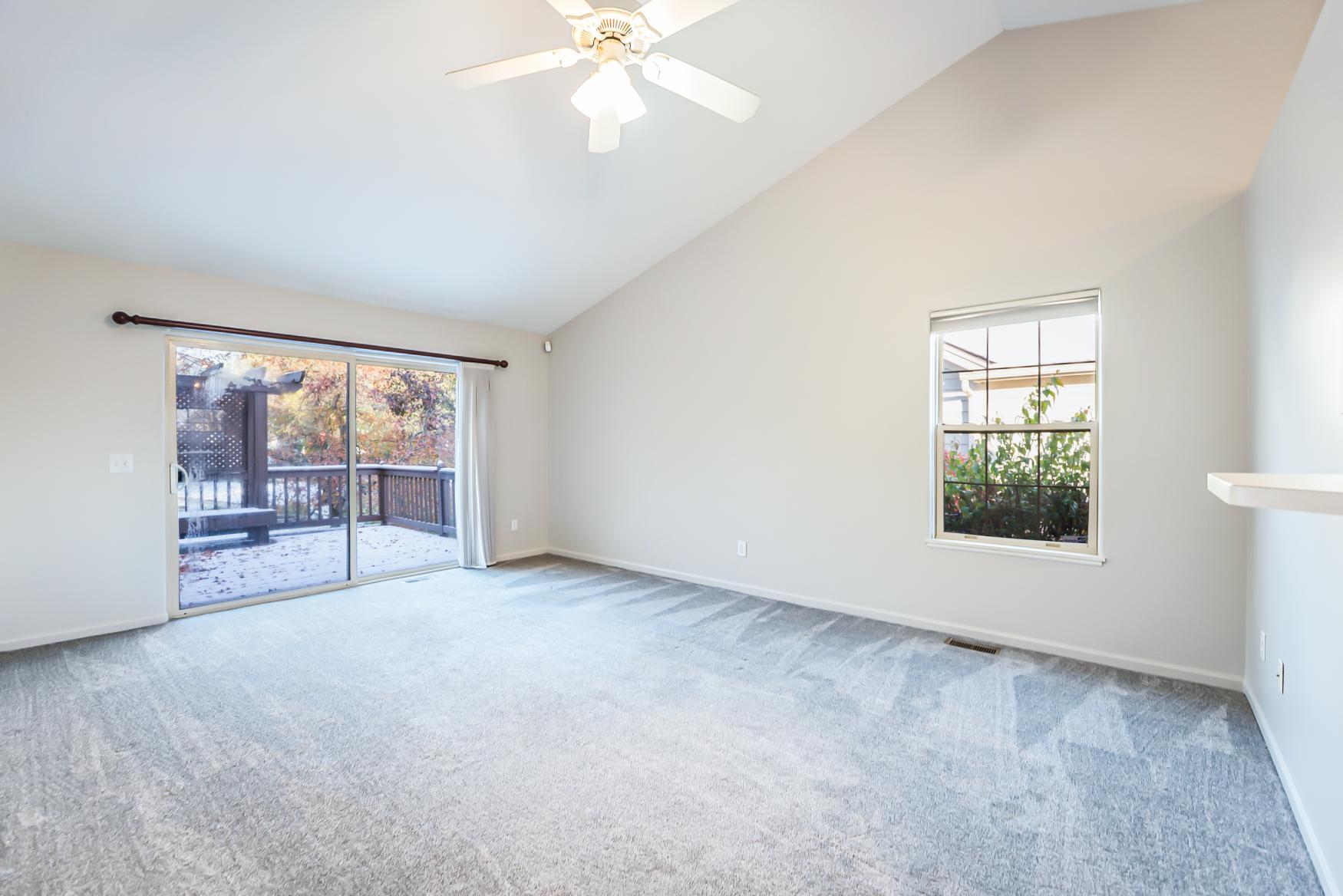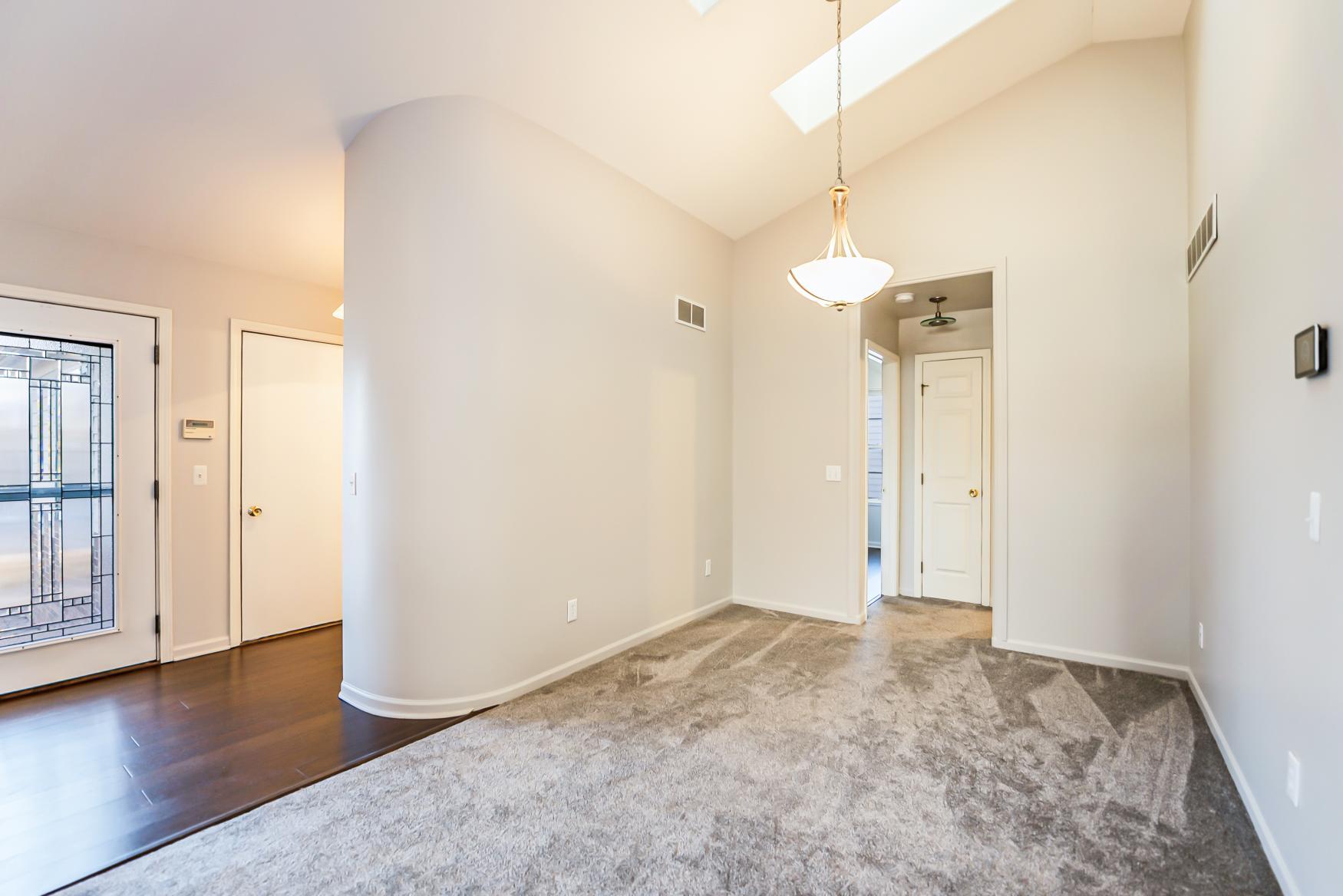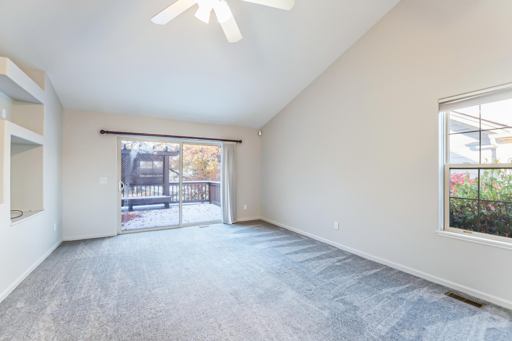 Step into the spacious great room, where cathedral ceilings create an open and airy ambiance. Natural light pours in through the patio doors, leading to a large deck that overlooks a tree dappled backyard – a serene retreat perfect for relaxing or entertaining. The open kitchen is a chef’s delight, featuring stainless steel appliances, oak cabinets, a cozy breakfast nook with a bumped-out window, and a large breakfast bar that flows seamlessly into the sunlit dining area, enhanced by skylights.