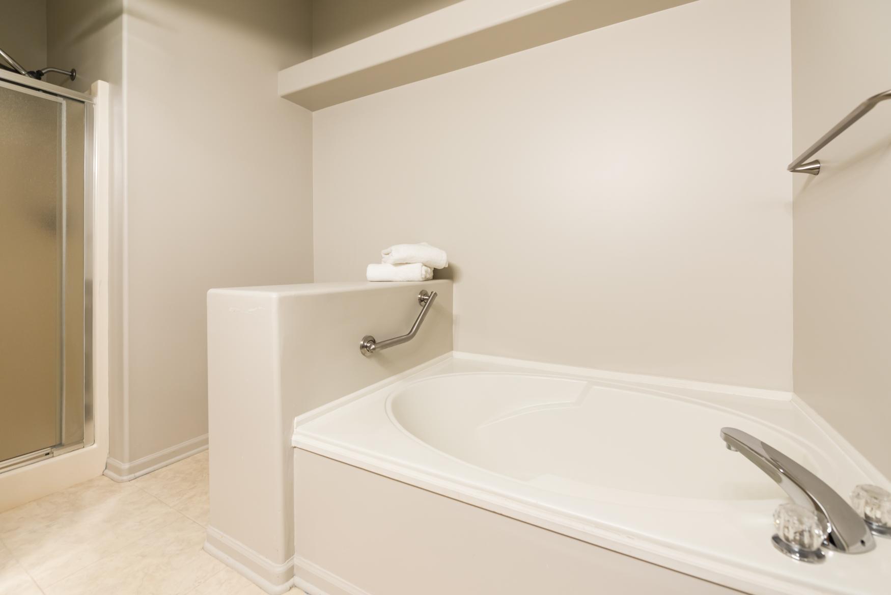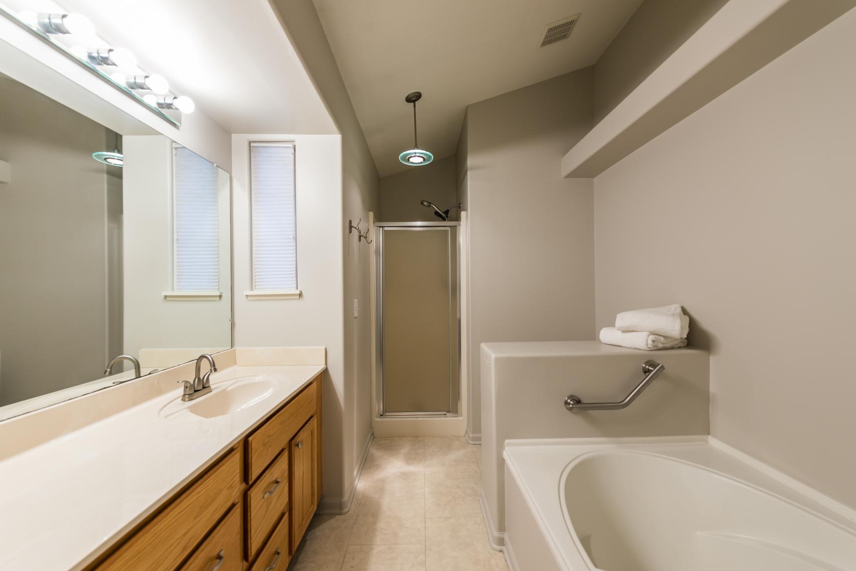 The main level boasts two generously sized bedrooms, including a luxurious primary suite with cathedral ceilings, a walk-in closet, and an ensuite bath complete with a soaking tub, separate shower, and a spacious vanity. The second bedroom, also with cathedral ceilings, offers direct access to the full-guest bathroom.