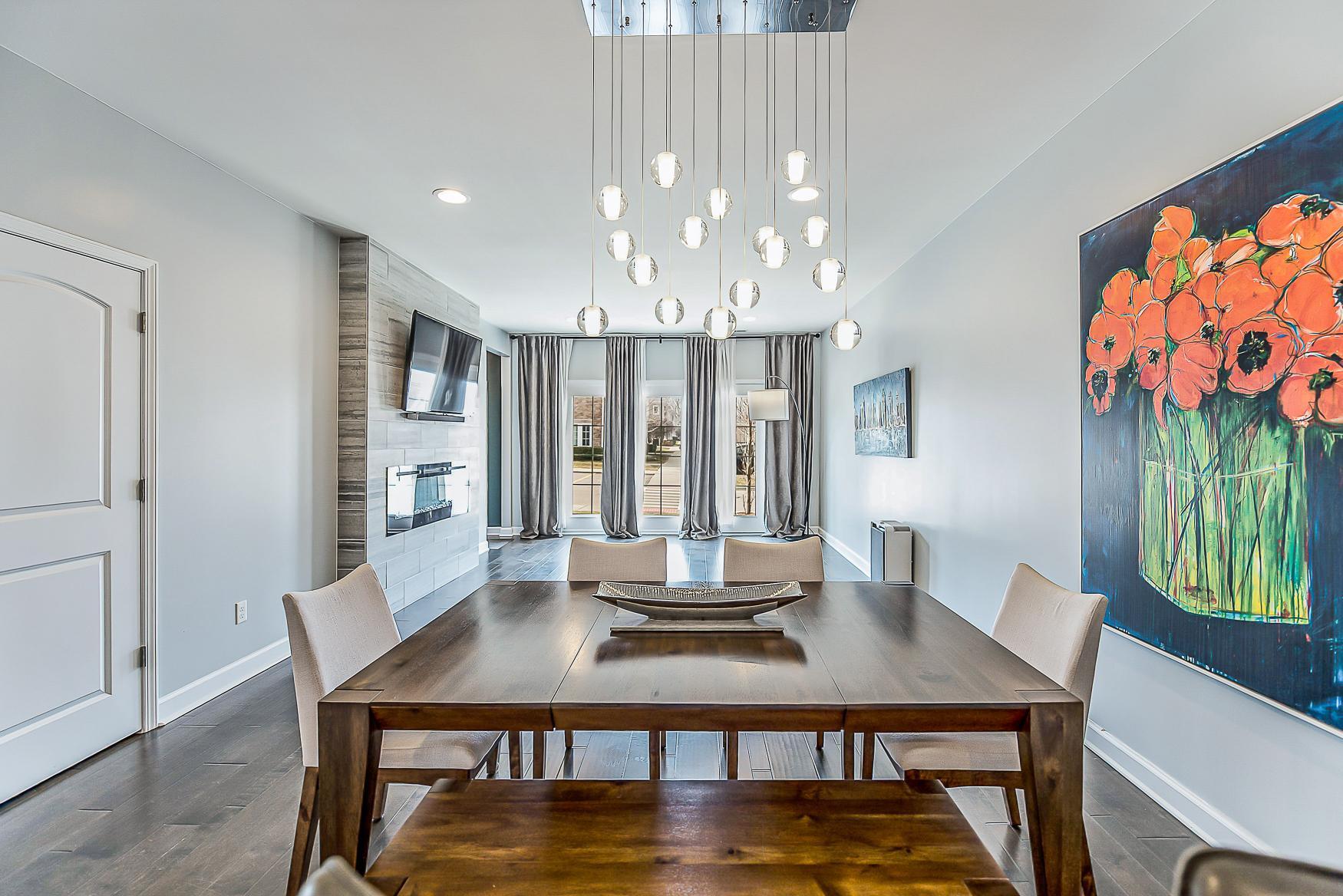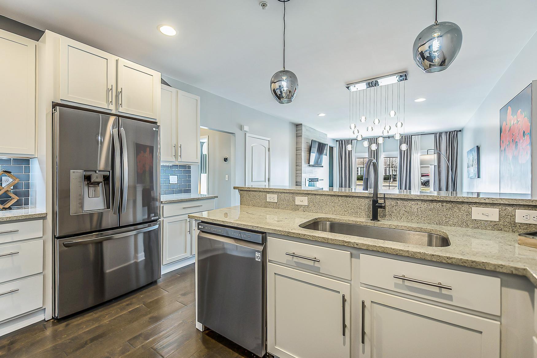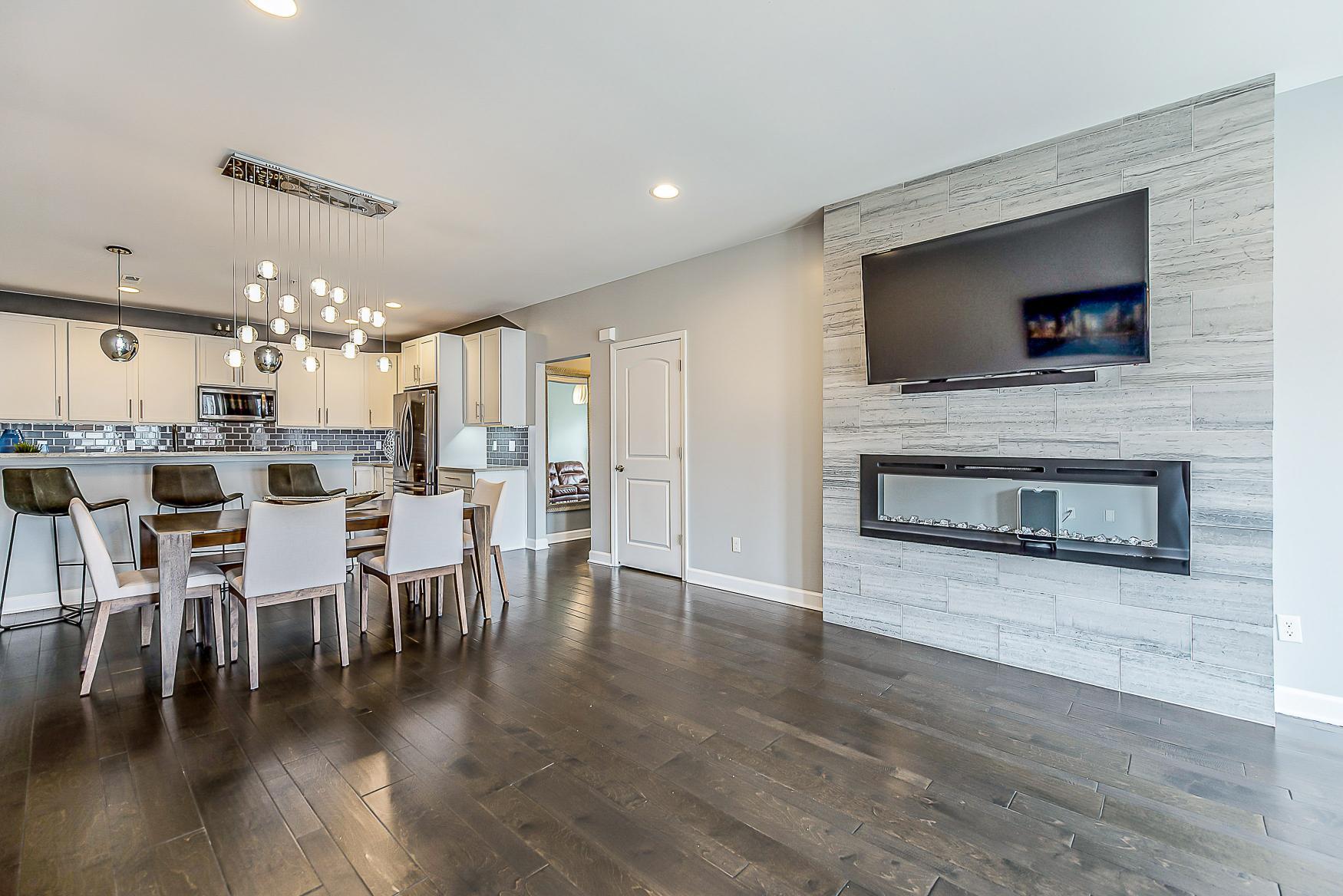 Step inside to find handscraped variable-width custom hardwood floors gracing the foyer, half bath, kitchen, and dining room. The living room is anchored by a breathtaking floor-to-ceiling tiled fireplace with an electric insert, creating a cozy and elegant focal point. The gourmet kitchen is a chef’s dream, complete with 42” cabinets, recessed lighting, granite countertops, a snack bar, and stainless-steel appliances.